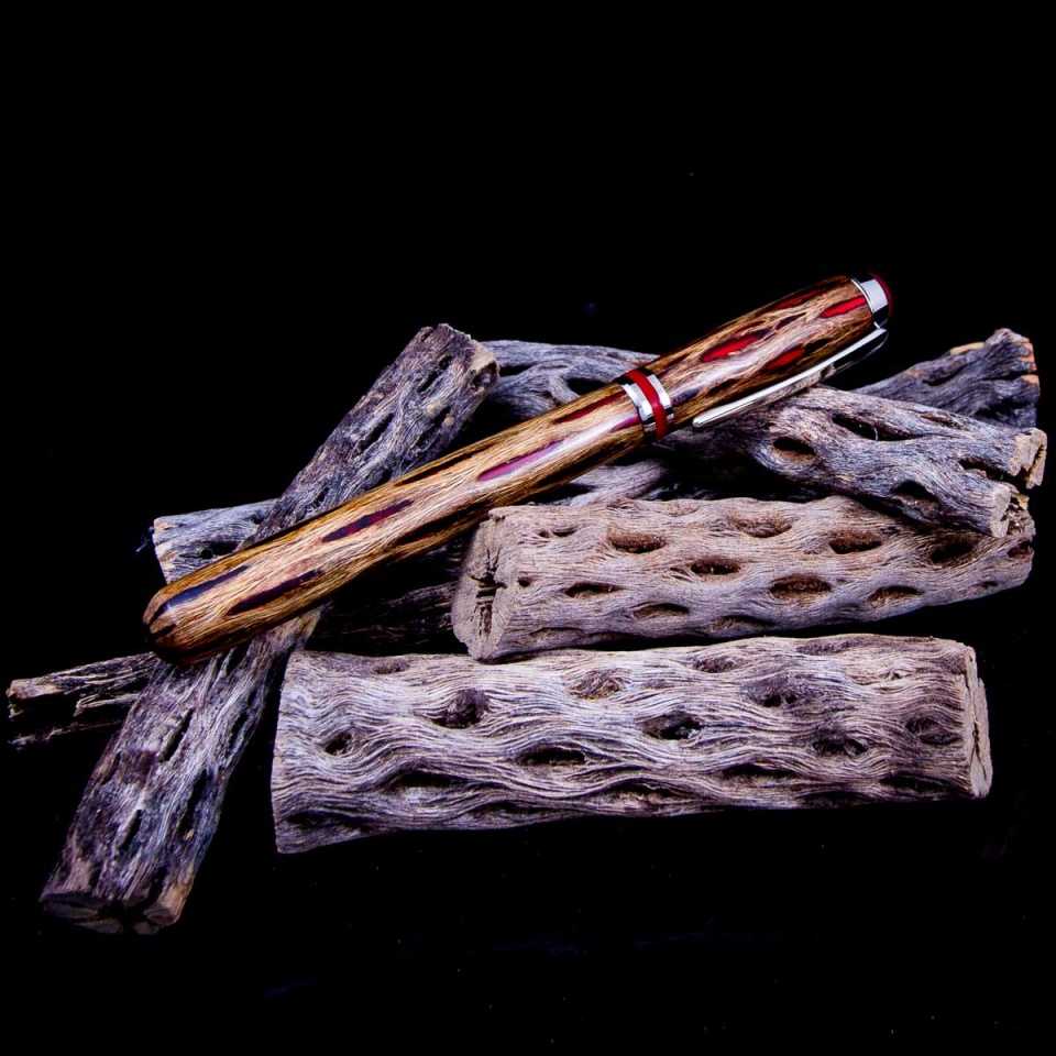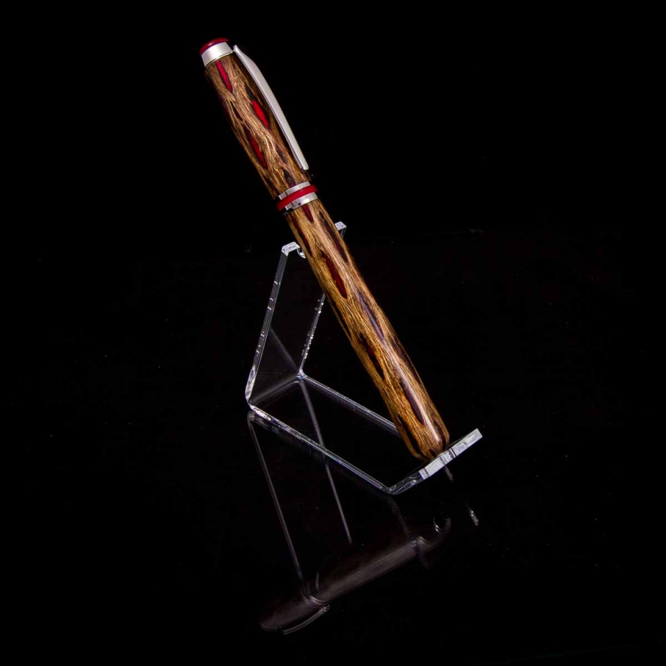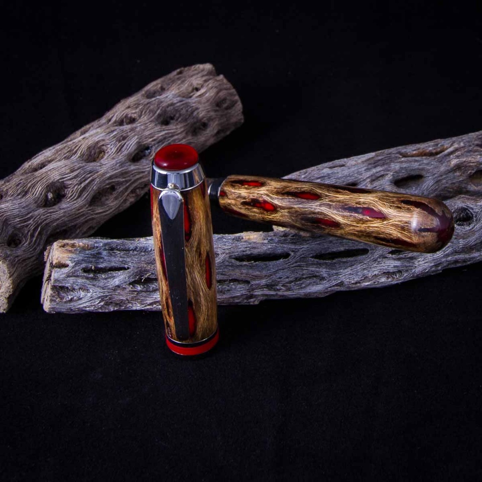 I was originally thinking I'd do a Sedona with this, but the cap trim ring on the Sedona just seemed to clash with the pattern of the cholla. I had some extra red Alumilite that I had dumped into a tube when I cast the cholla... So I switched to a Baron and tried to do something just a bit more rounded on the top of the cap to better math the round end on the body. I back painted the trim ring white, and in retrospect, I think I would have gone black as it's kinda bright. I forgot to back paint the dome on top, but not sure with the silver underneath it would have made much difference. You can kinda see the center stem if you look for it, but it looks ok in person. All in all... I'm happy with the result and learned a few things for next time.