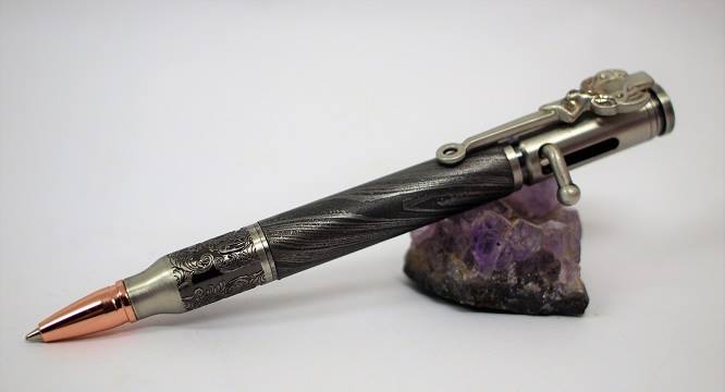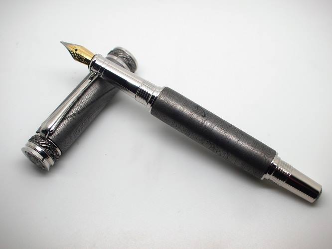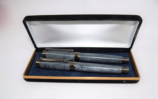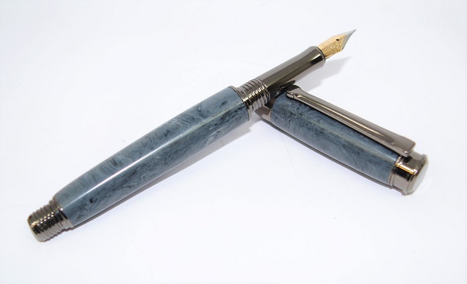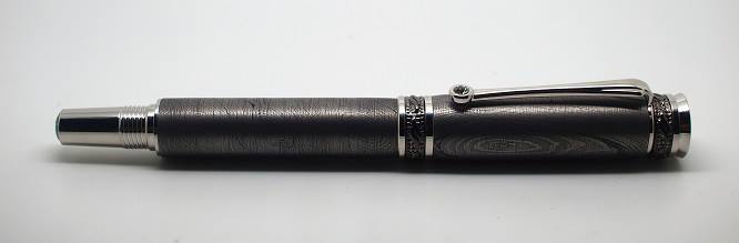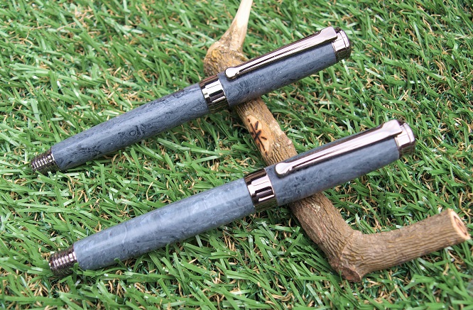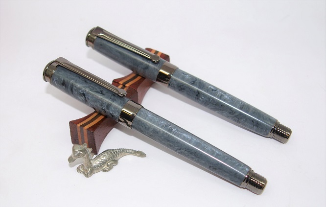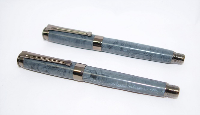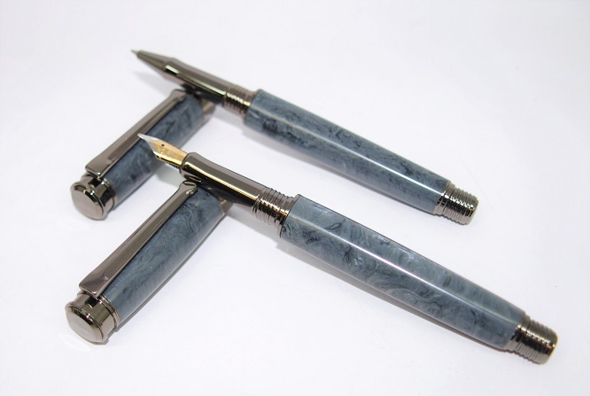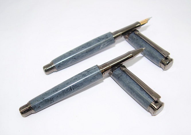A Leveche Gunmetal Pair of Roller-ball & Fountain pens. made using Faux Damascus Steel from Devine Island Design