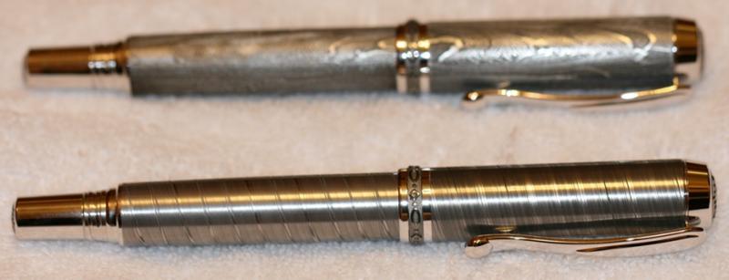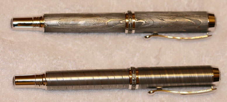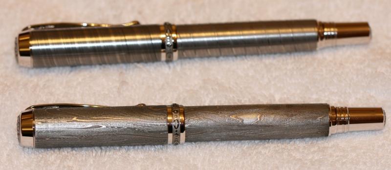 Here are a few samples of Roy's Damascus Steel. One is a twist and the other is a high contrast carbon. These pens are gorgeous!!! Hopefully they sell quickly as the wife is not so happy about the cost of the blanks. :wink: