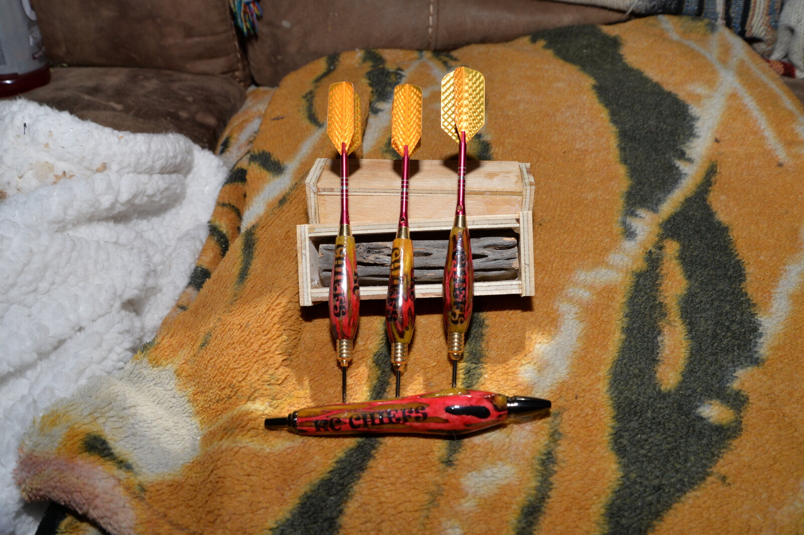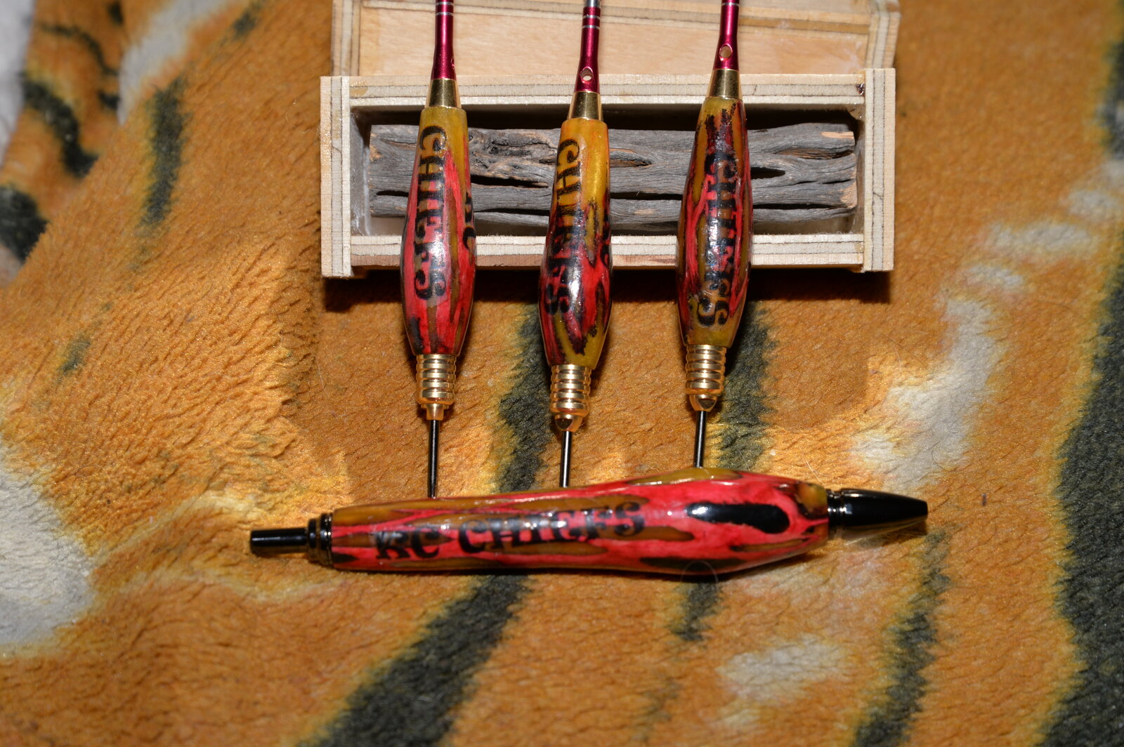 these are my latest used Alumalite clear slow with yellow alumidust, cholla cacti, stained with Artisian premium red dye(the dye was applied with a Qtip), black nail polish, decal my own(tried to use a different font to keep out of trouble) lacquer finish