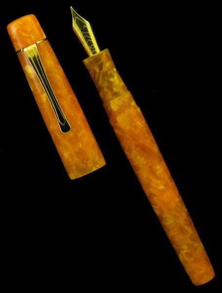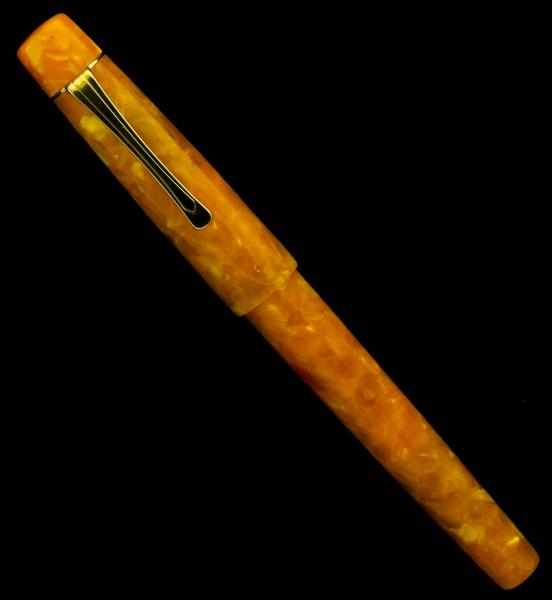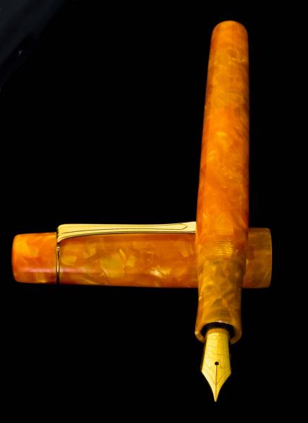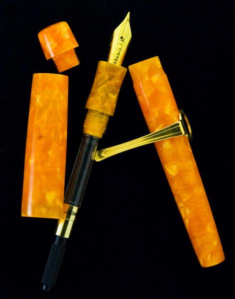 Finished it yesterday. It's a custom fountain pen in orange crush Italian resin called Oro...with a #6 Medium Point Gilded Bock nib. It's postable and it's my first try at an exposed clip! I should have made it to a 12 mm rather than the wider 14 mm size..looks a little too tapered. LOL..had fun anyway..Hope you like it. Doc:smile: