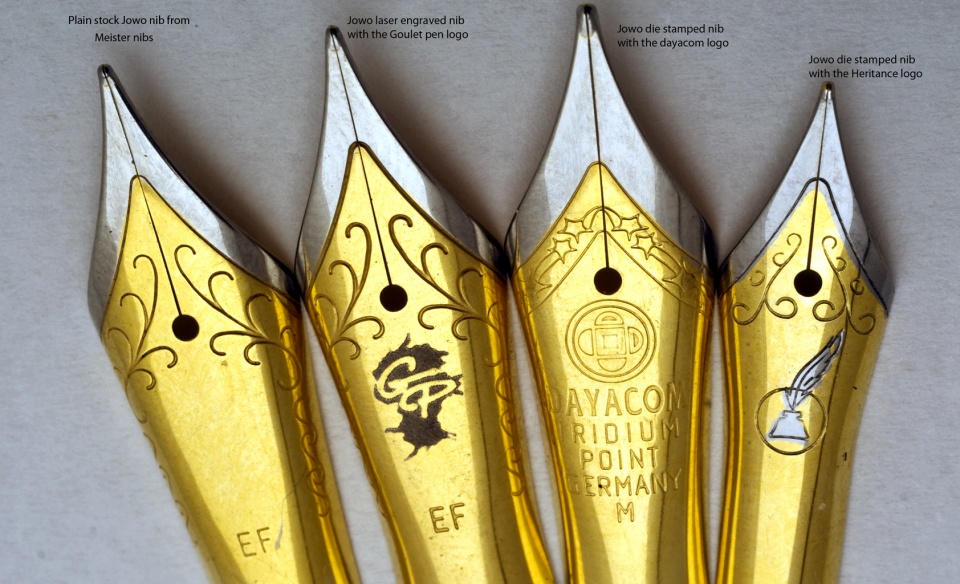 It was brought to our attention by Ed Street in his full review on "Jr Aaron from dayacom/signature pen supply (featuring Toni's polymer clay)" that the nibs on their full sized components and on the components imported by Jon David are JoWo nibs and not to interfere with his thread I though we could discuss the pros and cons of the nibs with the Dayacom logo.