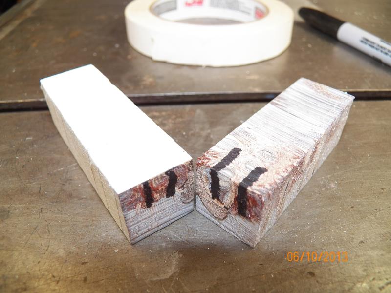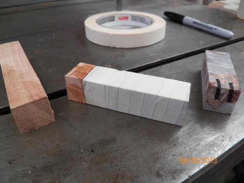 Before you wrap the blank(s) with tape, you should cut and mark the position of the 2 halves (if you are making a 2 barrel pen), marking it in such way that will allow you to see those marks even with the blank wrapped, this is achieved by marking the blank on its surface and then on the end-grain (joint faces) as the pics illustrate,