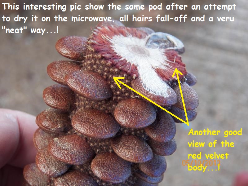 One other aspect of these pods that I don't think that I have made much reference to, is the fact that, the pods when transform from flower to the pod itself, changing its appearance to very hairy and dark brown in colour, that would be what some people would think was the end of the pod maturity however, this is far from the truth, the pod stays attached to the tree, after the first year and it does so because the pod is not yet developed inside.