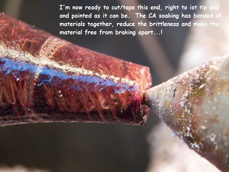 Firstly, we are dealing with a pod material that is not a solid piece, is composed of many parts, as shown previously, some of these parts/components are embedded with Polyester resin however, you should not forget about the red velvet "devil" that comes up to annoy you all the time but, the solution is simple, thin CA soaking, in consecutive layers, there is, the CA will only soak about 2 or 3mm deep before the, "repellent" characteristics of the red velvet, stop the CA on its tracks so, you soak/harden a little, you remove a little and so on...!