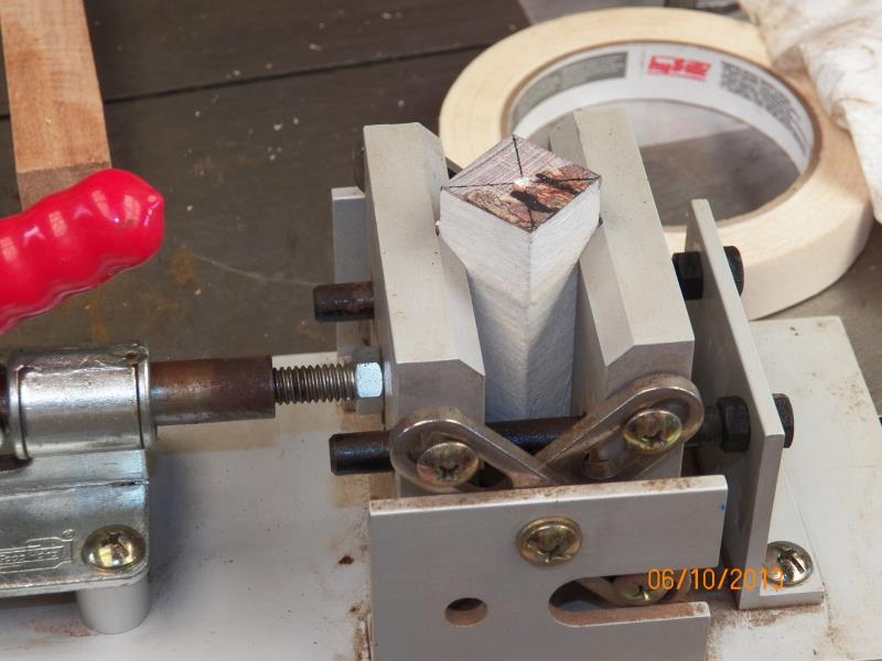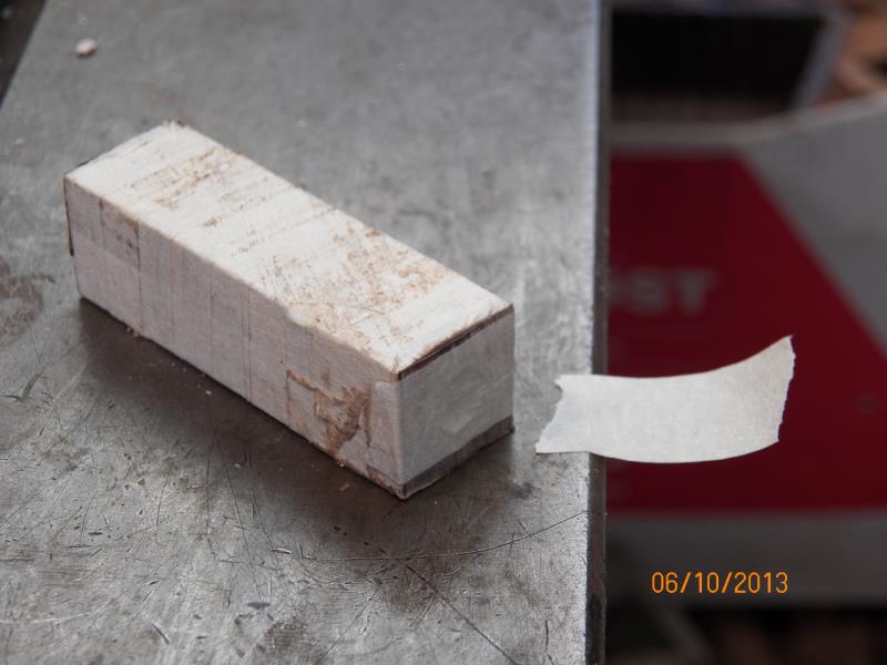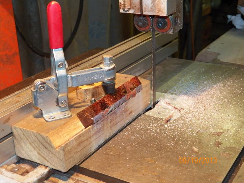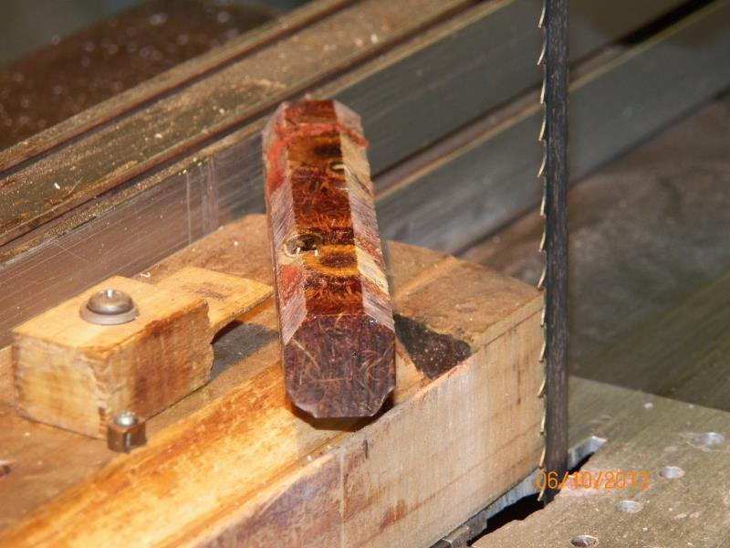 After you drilled you blank(s) to size, cut the sacrificial wood block, using the bandsaw,