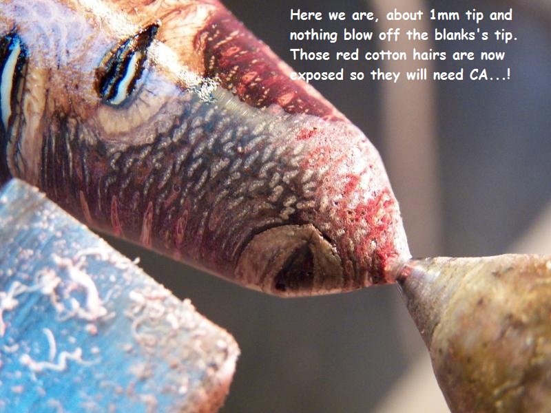 There is only one major factor that allowed me to go that thin, as per the pic above, without any support in the blank, and that was the correct CA soaking of that inside hole. If done right, the thin CA will penetrate at least 2mm from the hole wall, in so, when you are getting to the last soaking layer/step from the outer part of the blank, the pod material is already a solid "mass" and is also attached/glued to the brass tube so, the chances of tearing/ripping a chunk of the soft pod material from the tube, will be almost impossible, allowing you to go as thin as you want/need...!