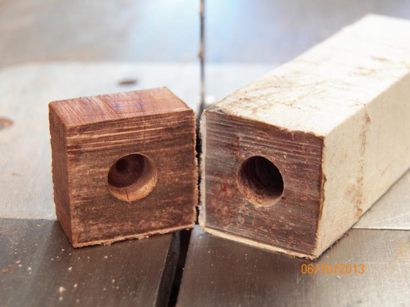 To avoid drill bit exit blow-outs, you can either leave the blanks longer or glue a "sacrificial" block, that is nothing more than a solid wood off-cut, this is by far the safest way...!