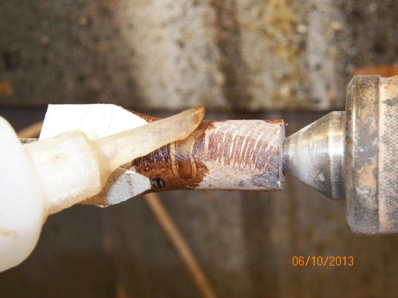 When dry/set, continuo on, removing the second layer, to about "little finger" diameter (average little finger size, I suppose...!), stop the lathe and repeat the CA soaking...!