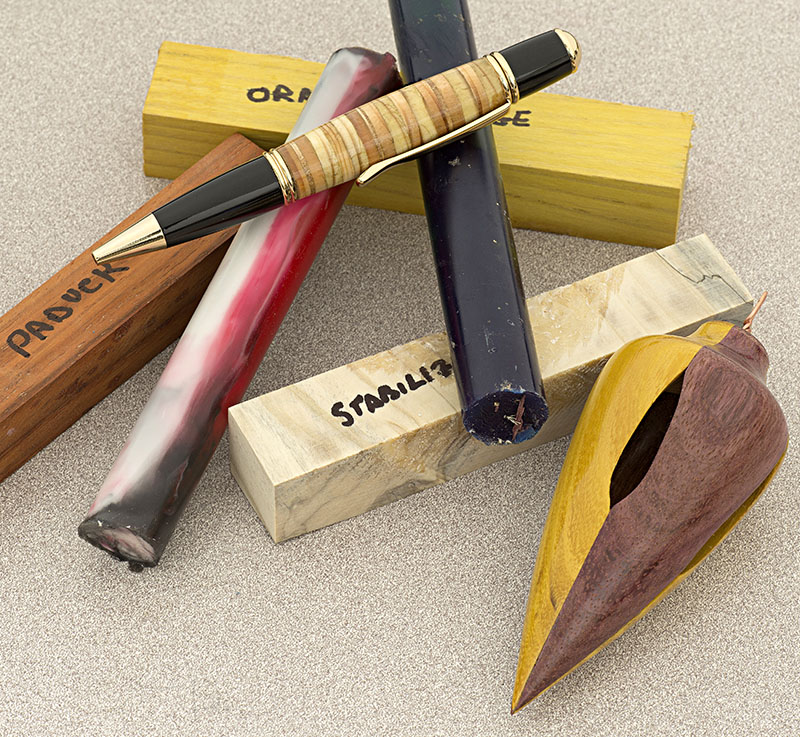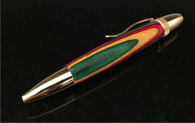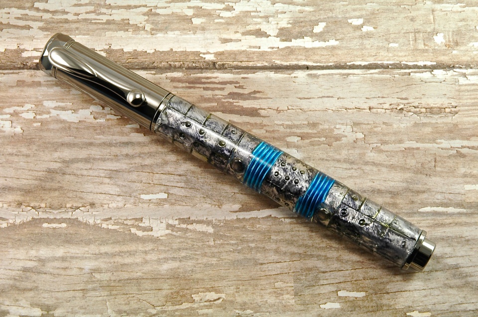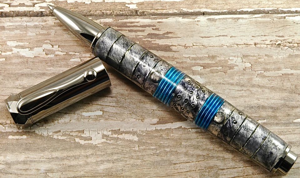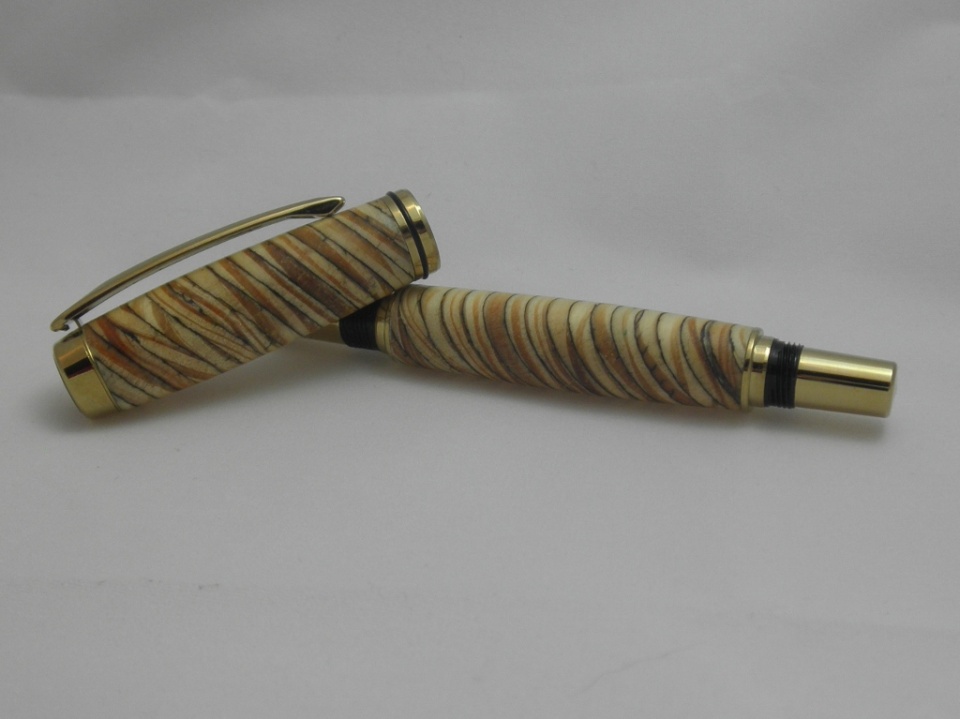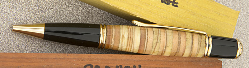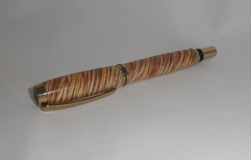 The pen is a Jr Gent Rollerball in Rhodium. The material is Structural Composite Lumber (SCL) that was salvaged from a build site in the high desert in Southern California. The application that the SCL was being used for was a high tech stairway being built in an architect's own home. I thought the material was interesting and, in the end, I think it made a nice looking pen. Its finished in CA.