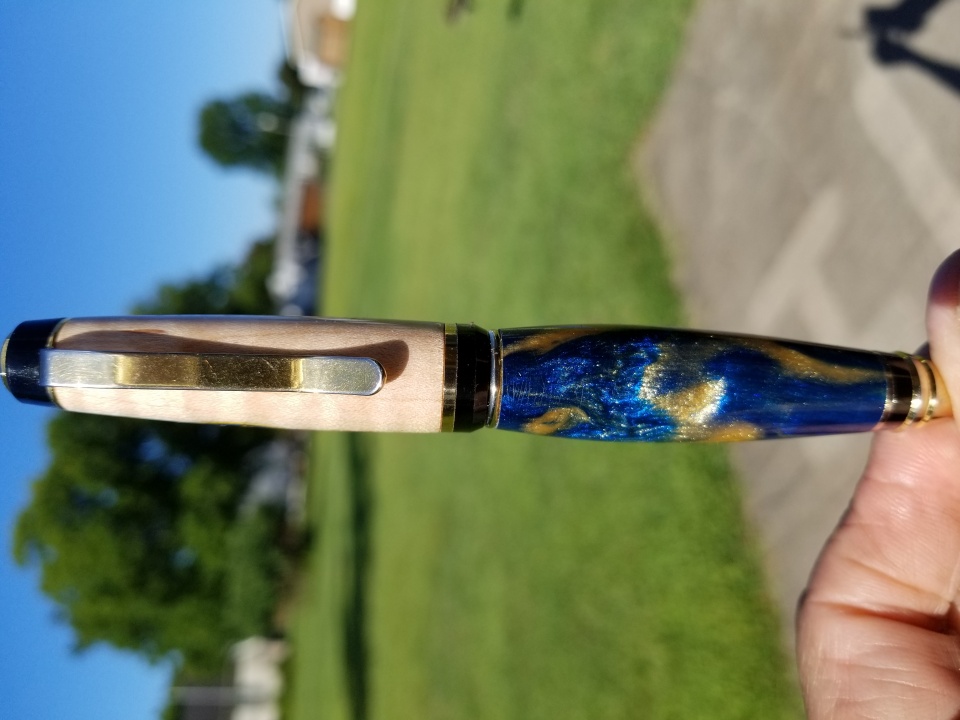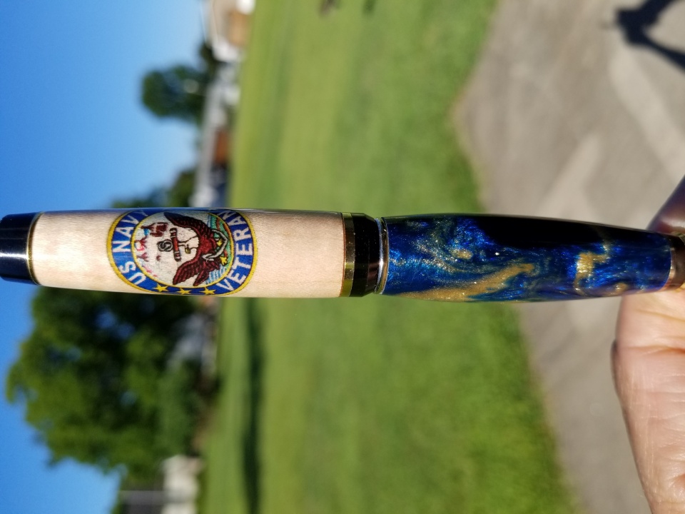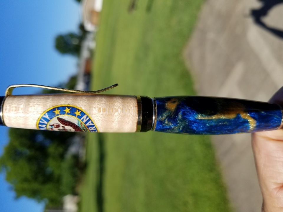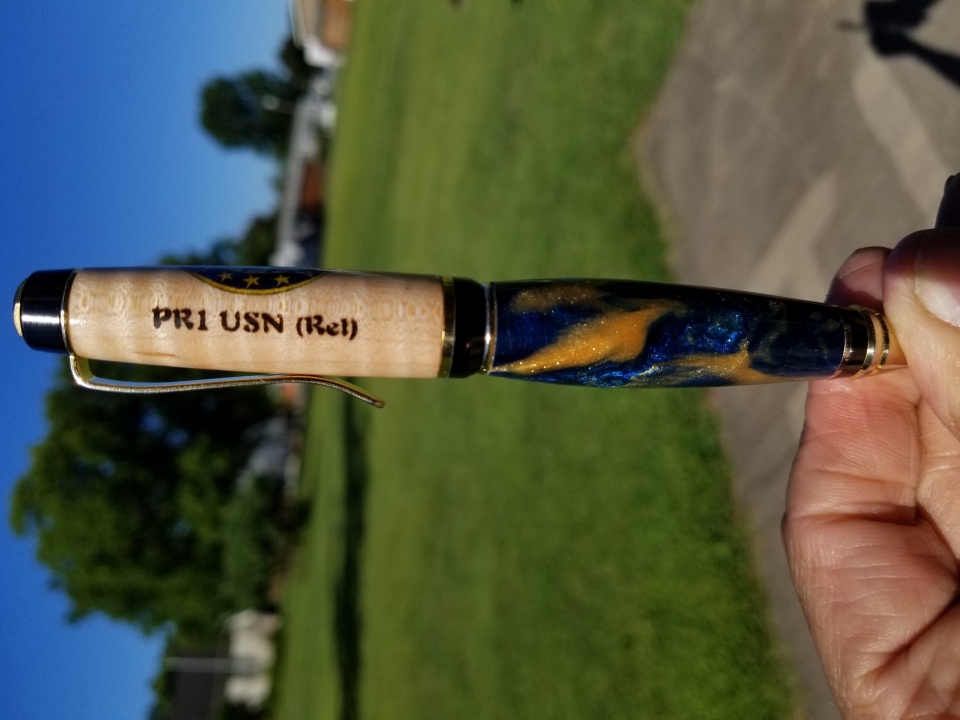 My Pen Du Jour a Gold Cigar dressed in a Laser Engraved Navy Veteran Decal Blank upper blank and Custom Acrylic Lower Blank. The upper barrel blank was an experiment with to see how well laser engraving and decals would work together. All C and C welcome. Thanks for looking.