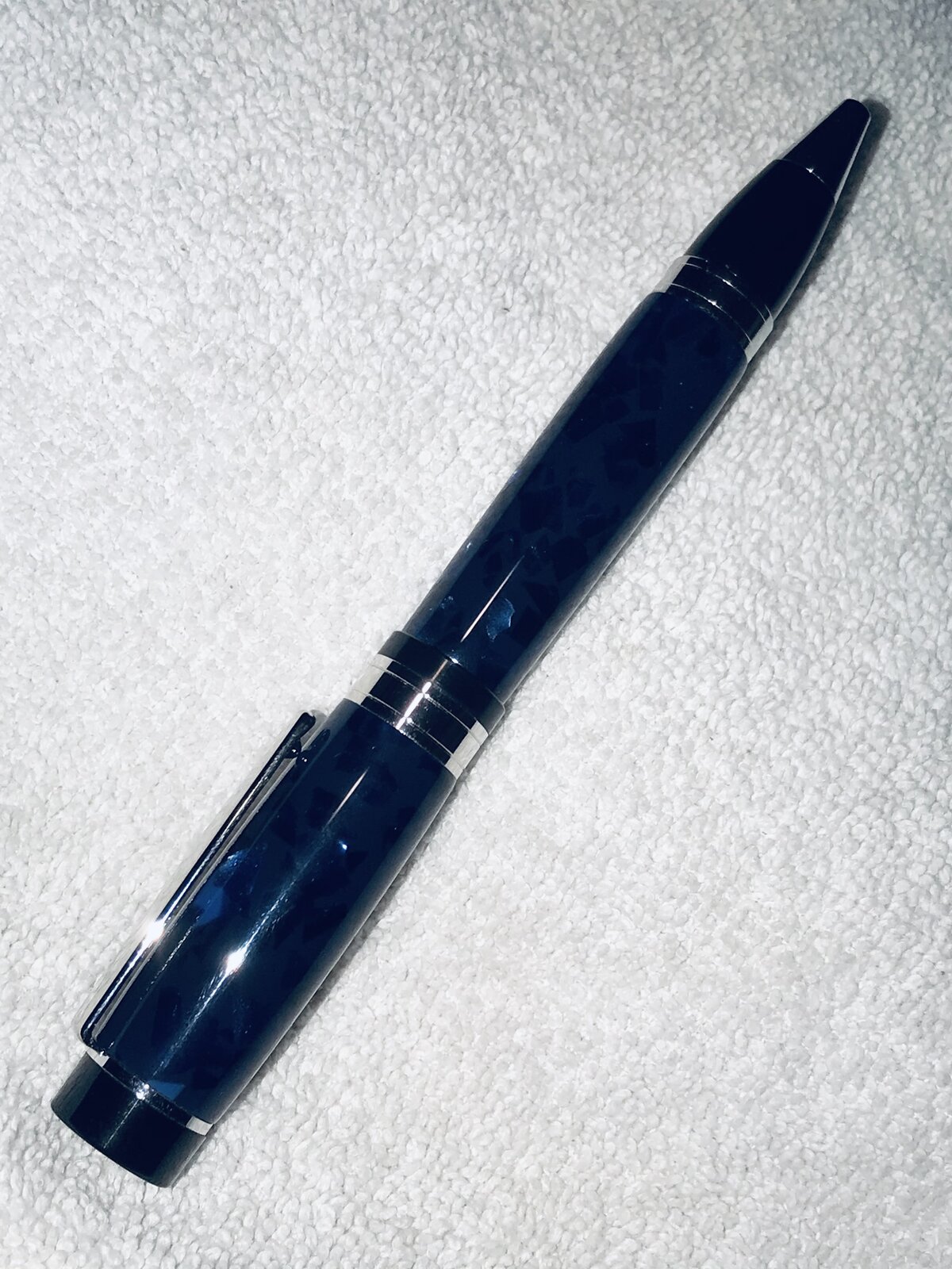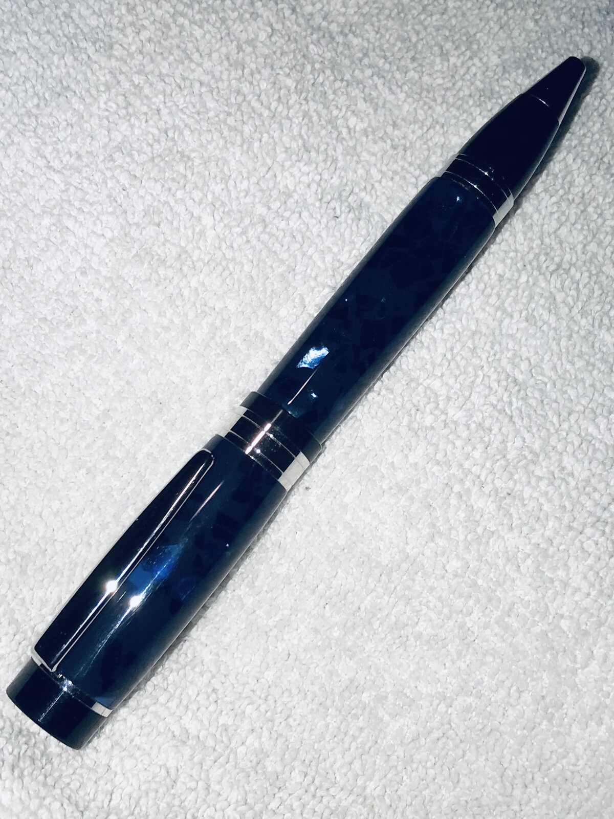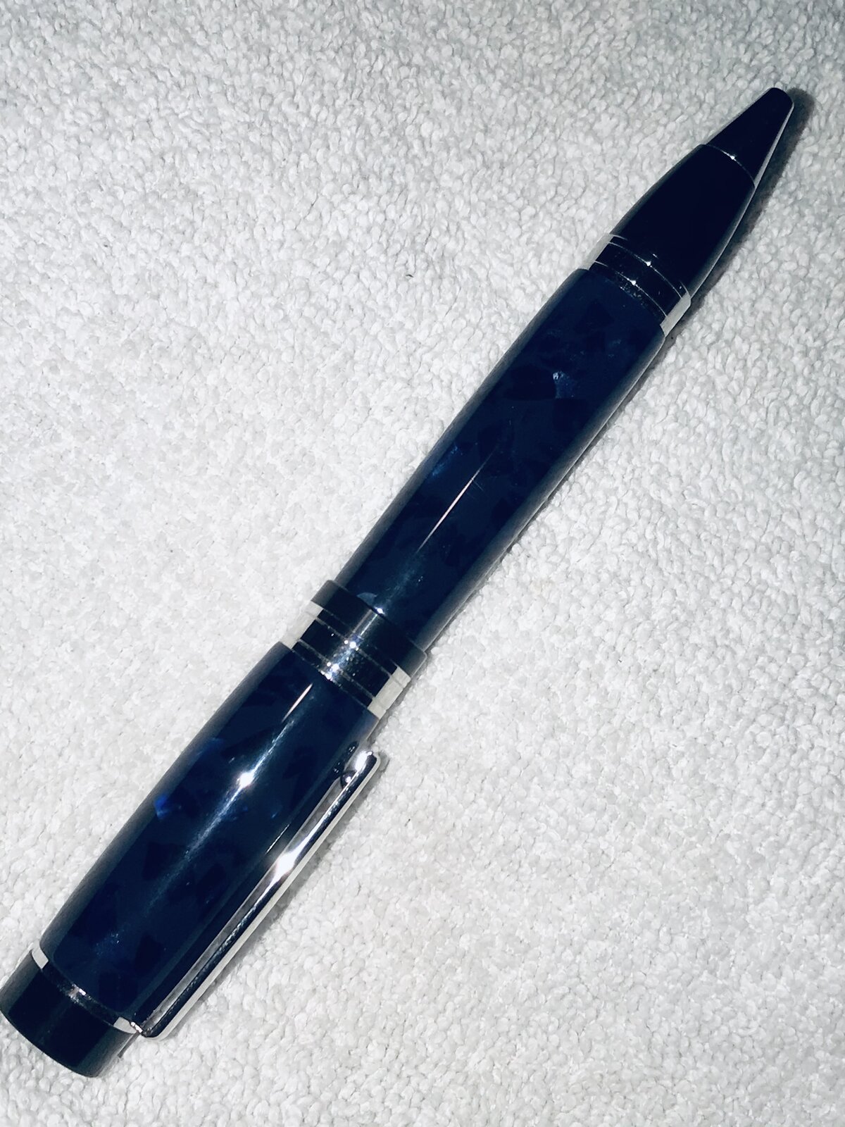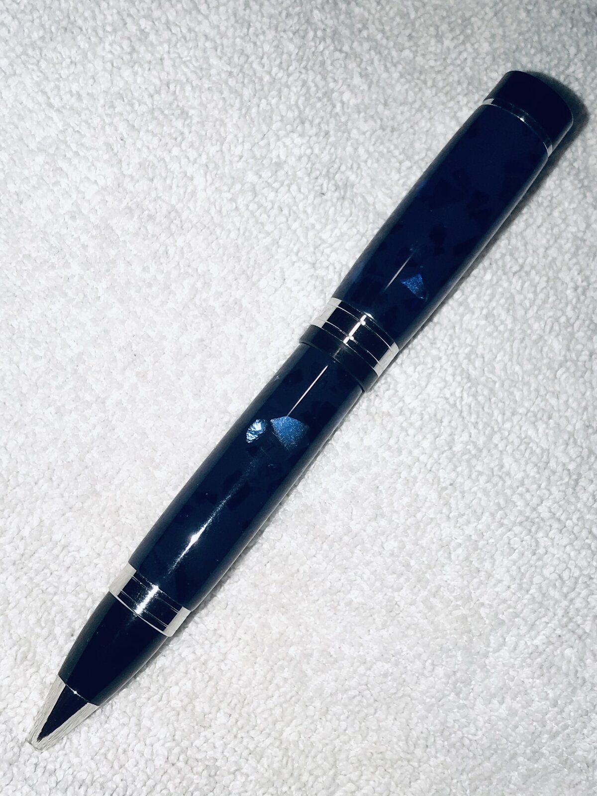 Had fun at the office today! Oops, I'm retired, so that must have been the shop. Took one of the last of my El Grande Convertible kits - works as a ball point by inserting a "Parker" style refill, or as a pencil by inserting the Schmidt pencil mechanism in place of the "Parker" refill. This kit is Platinum, and I chose a very old piece of acrylic, Deep Blue AA38.