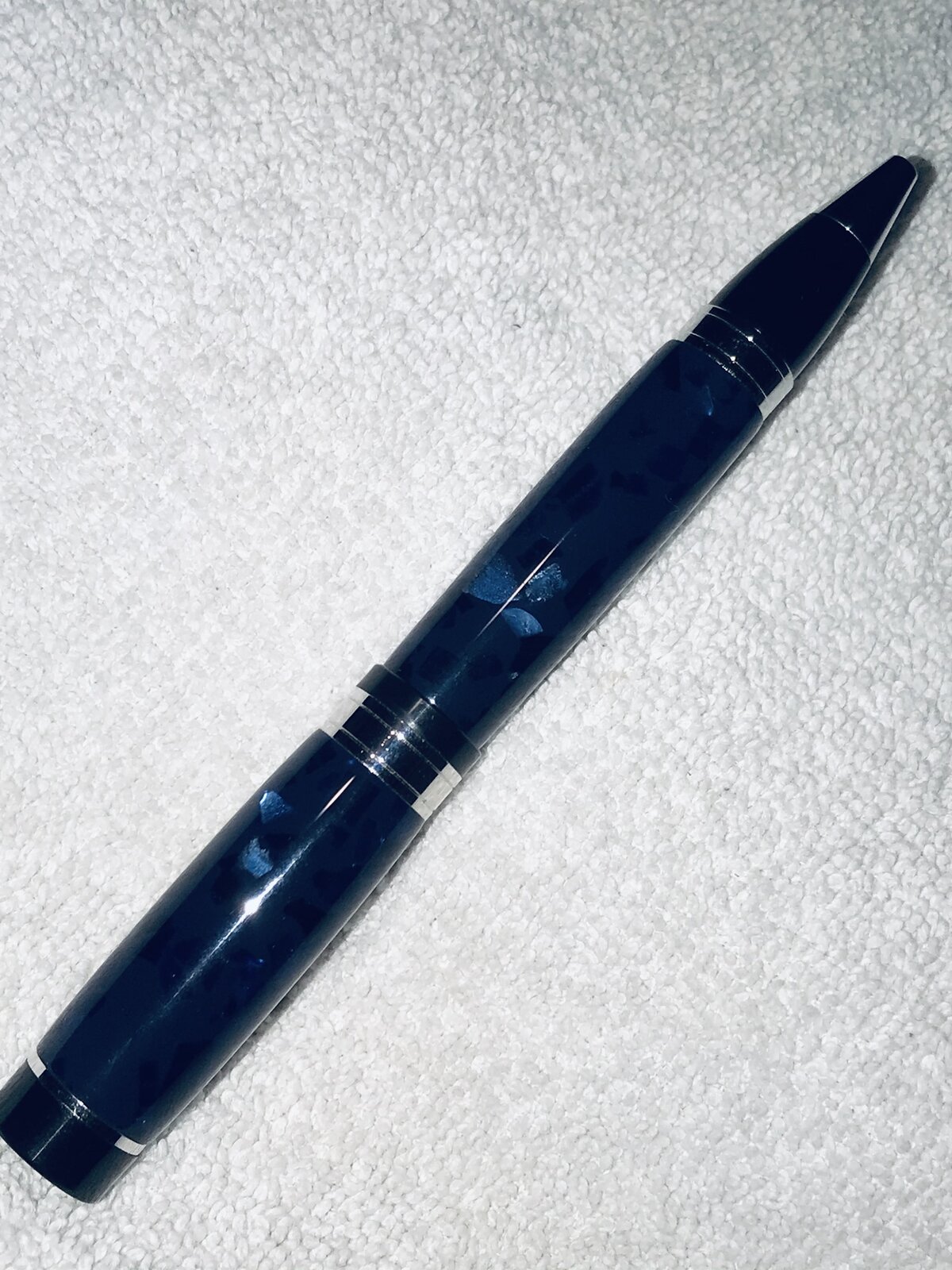 Tried something different following shaping. Many - a few - folks on here categorically state the is no need to remove the blank from the lathe for finishing. 20+ years of turning experience says, for me, that is just not true., regardless of the "touch" on the sanding medium. SO, when I got to MM, following final shaping with 320 grit dry sanding, on the lathe @ ~ 800 rpm, I tried something different. In wet sanding with the MM pads I alternated orientation: 1st pad, horizontally off the lathe and continued with that pad until no radial ridges were evident - only horizontal ridges were seen under 6x mag. Wipe barrel dry, and put back on the lathe; sand at ~800 to 1000 rpm, lightly with next pad until no horizontal marks are evident. Next pad, off the lathe, etc etc until the last pad, then finish with MM Micro Cut and polish with soft cloth.