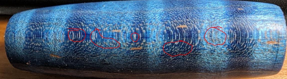 I am new to turning stabilized wood so I am not sure if what I am experiencing is normal , a defect, or something I am doing. After turning the blank down to size I find these marks or portions without dye. I have tried four different blanks from two different suppliers with the same results. Can anyone help identify the problem?