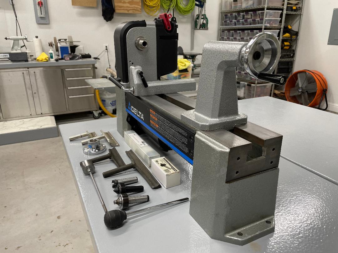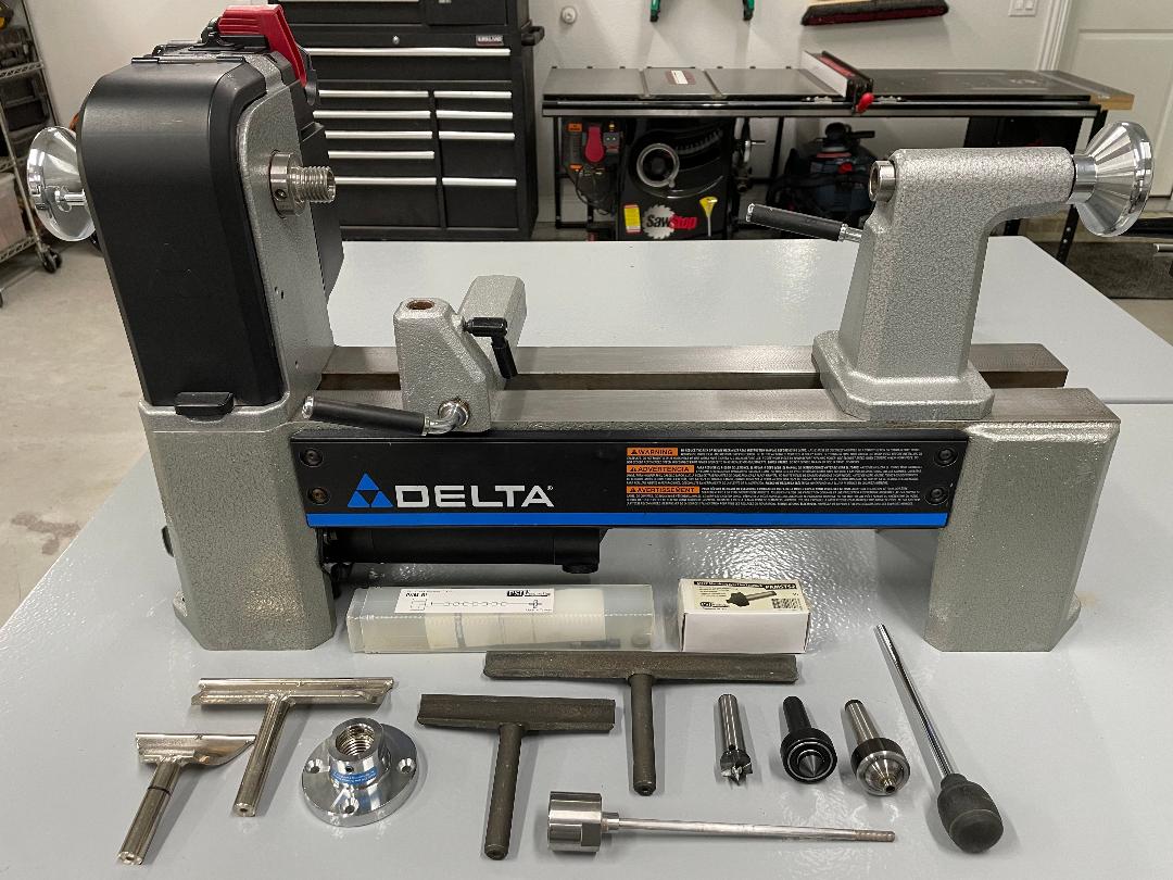 This Delta Midi Lathe is in great condition and ready to make many turned projects as pens, bottle stoppers, bowls, etc. This unit is about 5 years old, but it is still a current model so you can purchase a bed extension or floor stand if you wish (not included). Currently this lathe is selling for $965.90. I am including the pictured pen making mandrel with a mandrel saver ($19.95 plus $23.95 – Penn State Industries). I am also including the chrome 3 1/2" and 6" tool rests as pictured as they are better sized than the stock tool rests for making pens ($43.95 – Penn State Industries). If you were to purchase this all as new, it would total $1,053.75 plus tax and shipping. I am offering this lathe bundle for $350.00 which is less than 1/3 the cost of new. I had some additional funds recently and purchased a Nova Neptune lathe, so I no longer have need for this duplicate equipment.