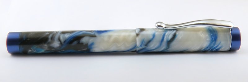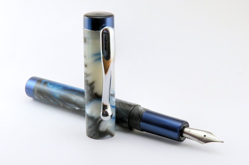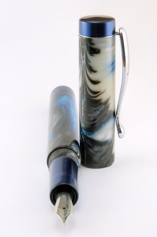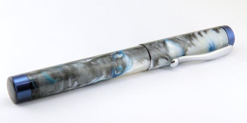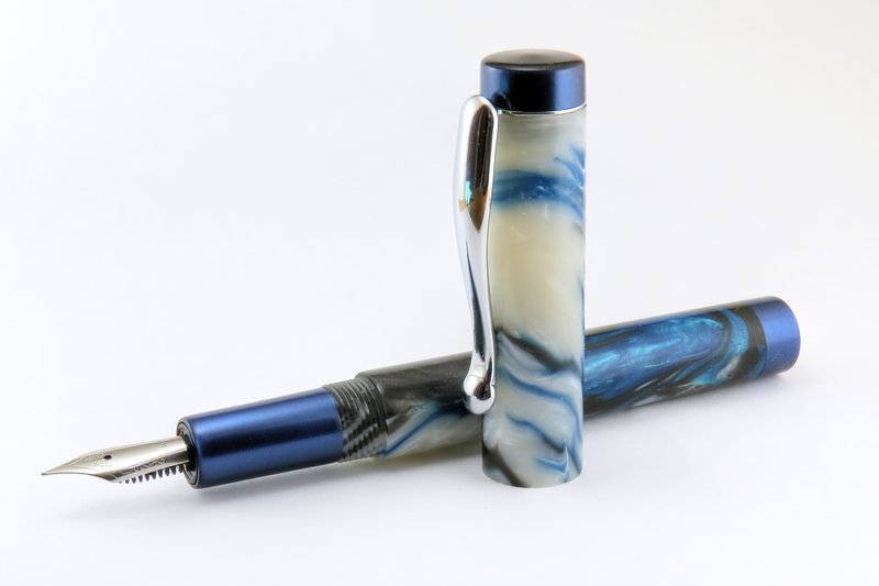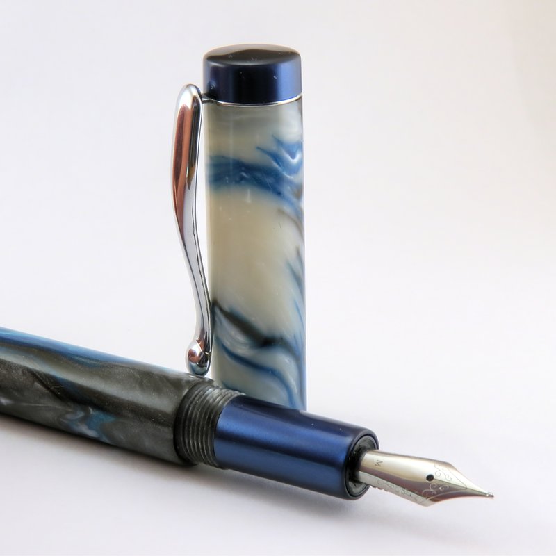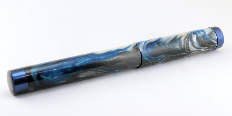 My first* custom fountain pen! I have dubbed this style "Denver". It features straight barrels with a slightly tapered section. Finials & section are made from Royal Blue Metallic from Exotic Blanks, and the body & cap are made from a blank I got from fool4peppers that I'm going to call "Ocean Depths".