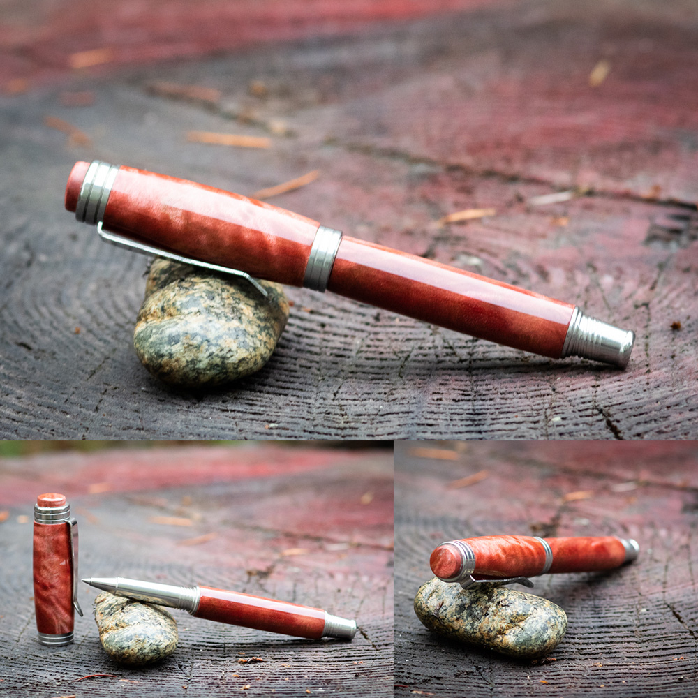 Completed a @McKenzie Penworks Desire kit on commission for a birthday present. Used a stabilized red-dyed burl from @Benpen. Really happy with how it turned out. The only issue I had is the threads are tight and the body would twist. Touch of epoxy solved for that. Really love the quality of the kit (and the blank!)
