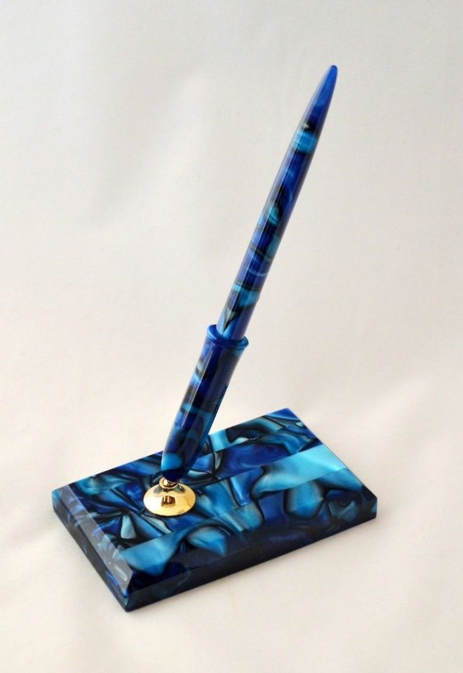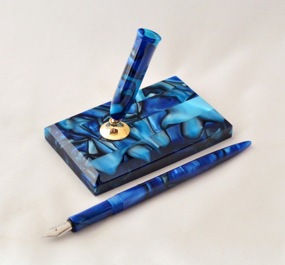Attached are photos of a custom-made fountain desk set recently purchased from a Pen Maker who does outstanding work and is a nice person as well. My go-to desk pen is a reliable Sheaffer TD, so this appealing acrylic w/ 6mm Bock nib will offer me an alternative option. This was part of a package deal including multiple pens and one just like it would be $150.00, per Pen Maker Glenn. Added options and more expensive materials would adjust the cost.