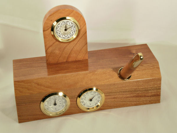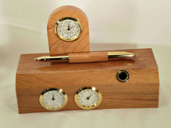Found this desk pen at Lau Lau Woods and since I was getting some other stuff I thought I would give it a try. I would have liked a smaller base but since I had to go to this size because of the pen holder and I already had the clock, thermometer and hygrometer already so designed the stand around that. The pen is a rollerball and at first it feels a little heavy on the cap end but it is comfortable to use and writes nicely. I'll put a nice high price on it and if it doesn't sell at the next craft show in November it's going on my own desk. All the wood is from the same piece of cherry salvaged from a pallet.