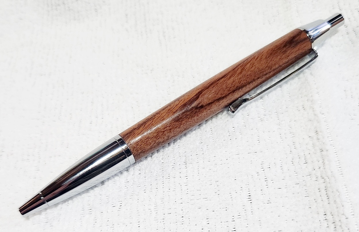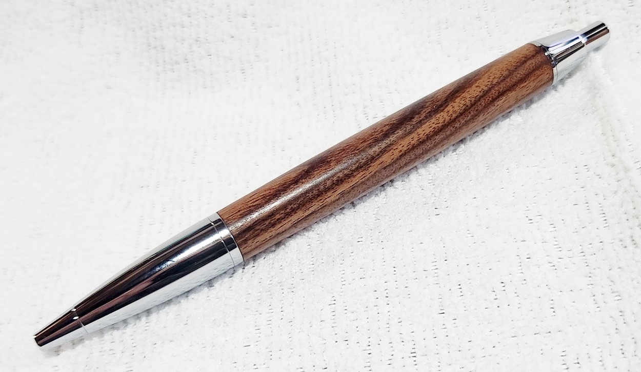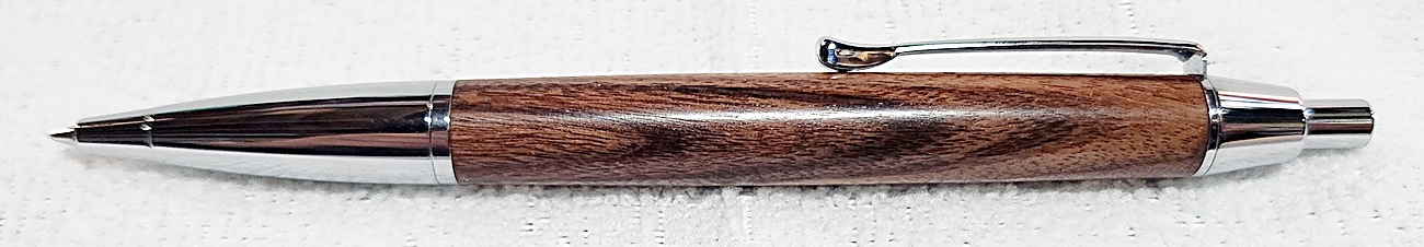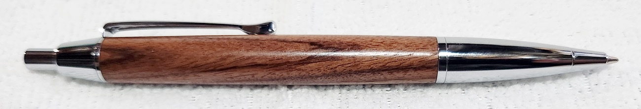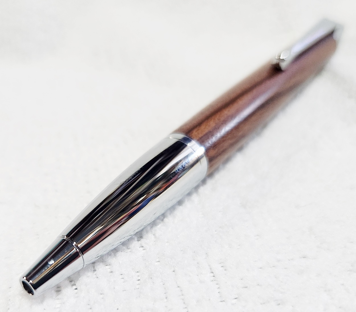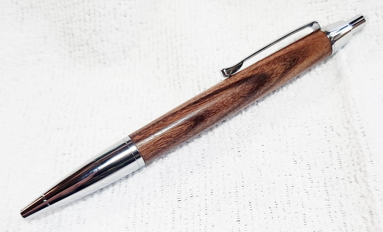 This is a Devin click pen in chrome, from PSI. The wood is Bolivian rosewood from Woodcraft. The finish is Pens Plus.