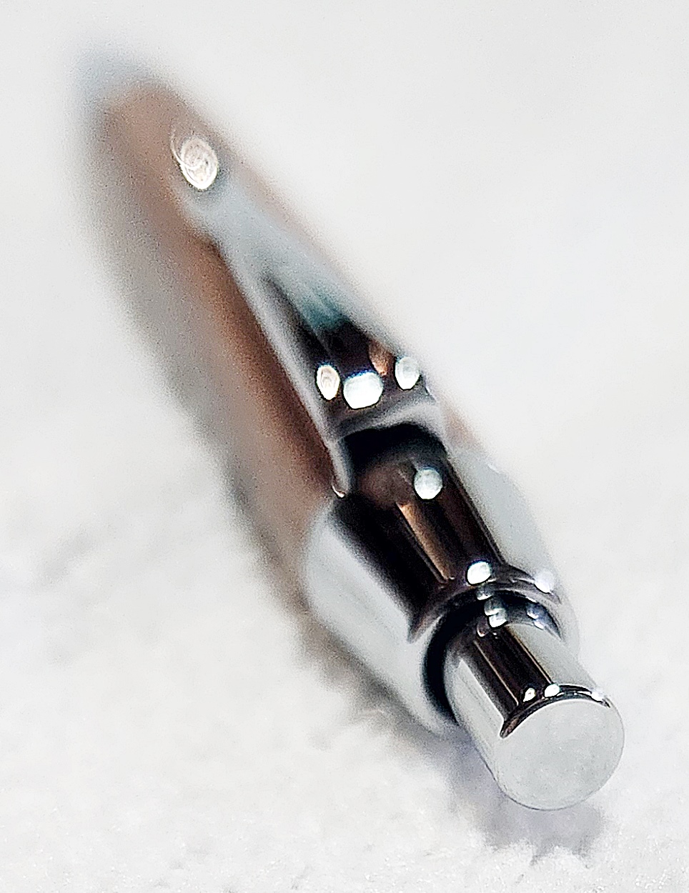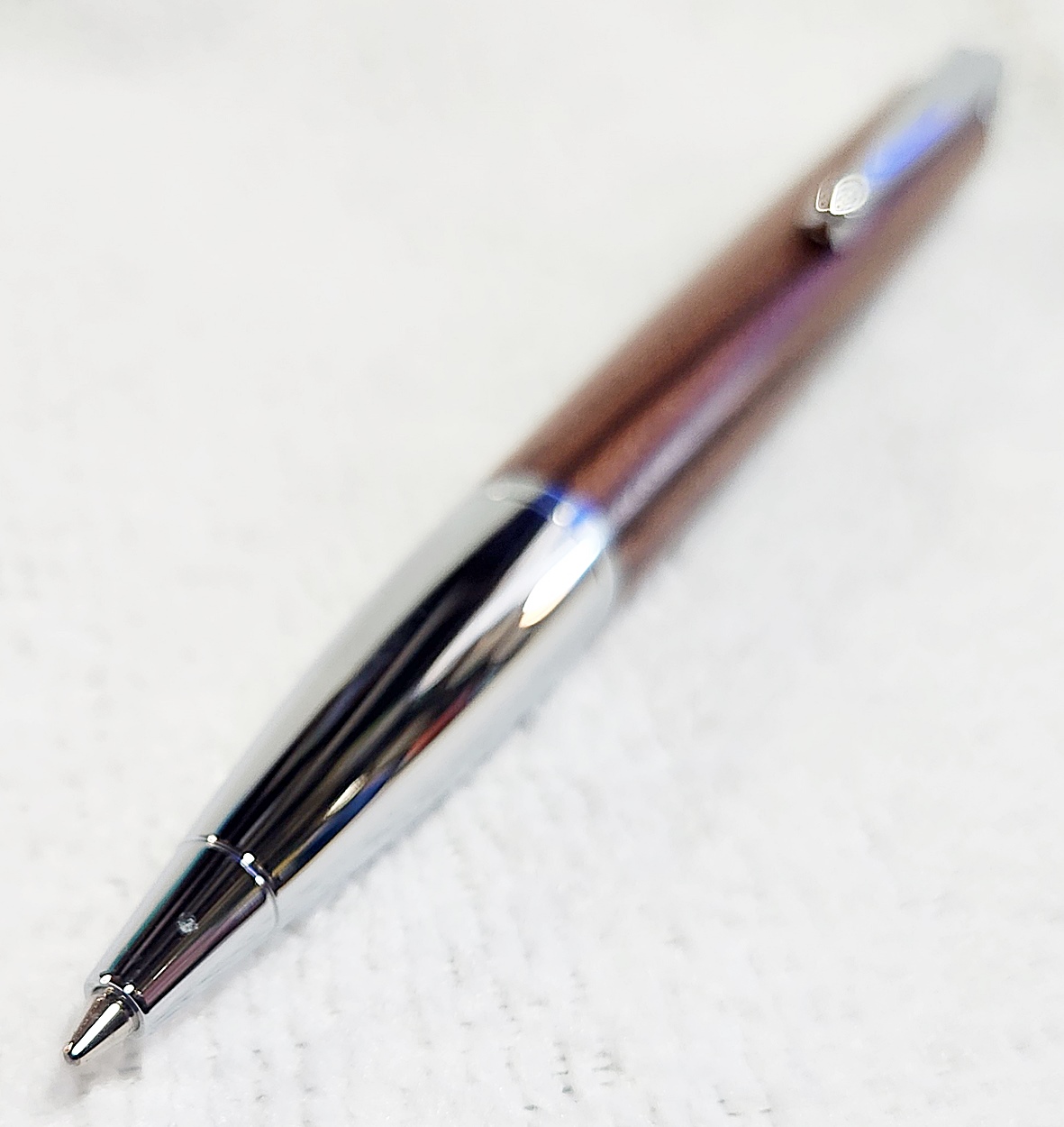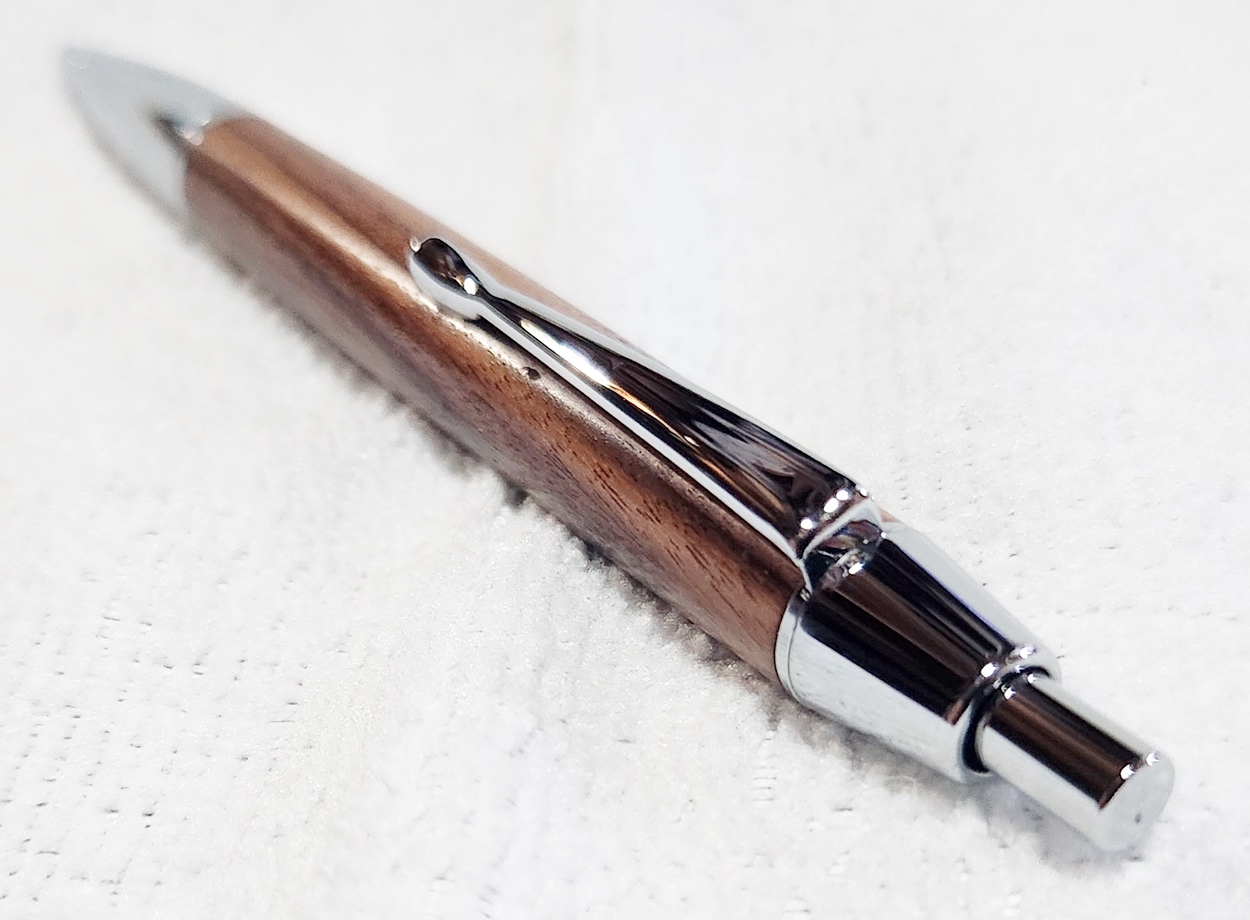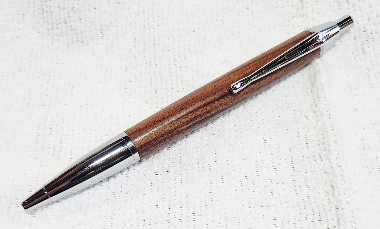 This is a Devin click pen in chrome, from PSI. The wood is Bolivian rosewood from Woodcraft. The finish is Pens Plus.