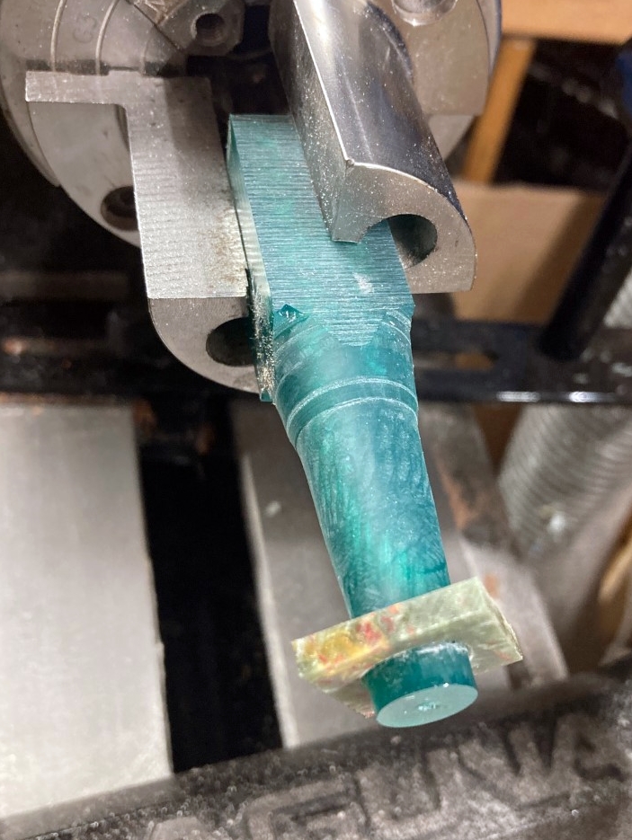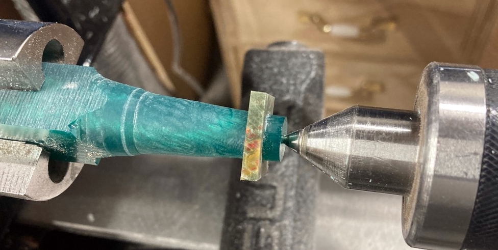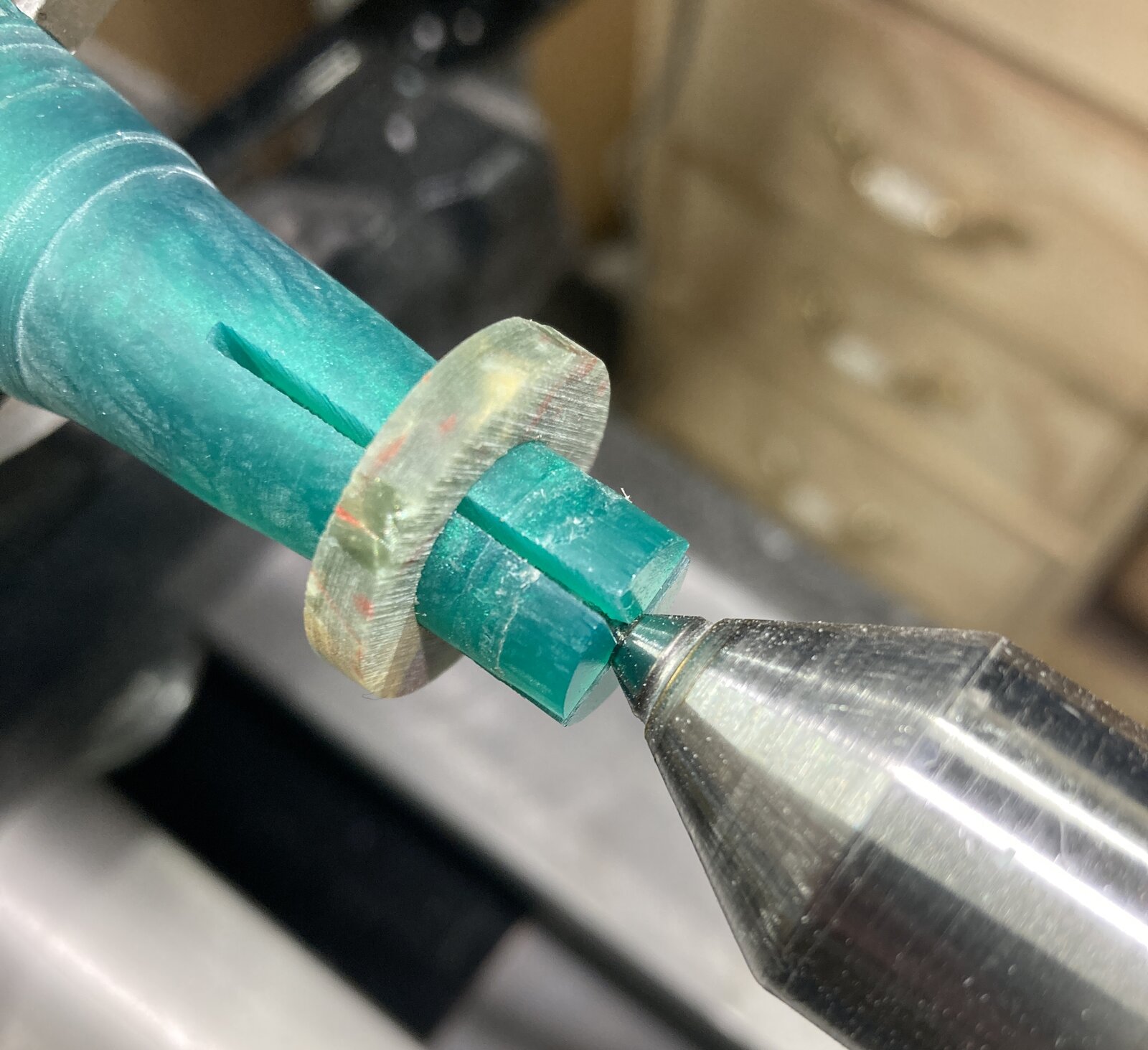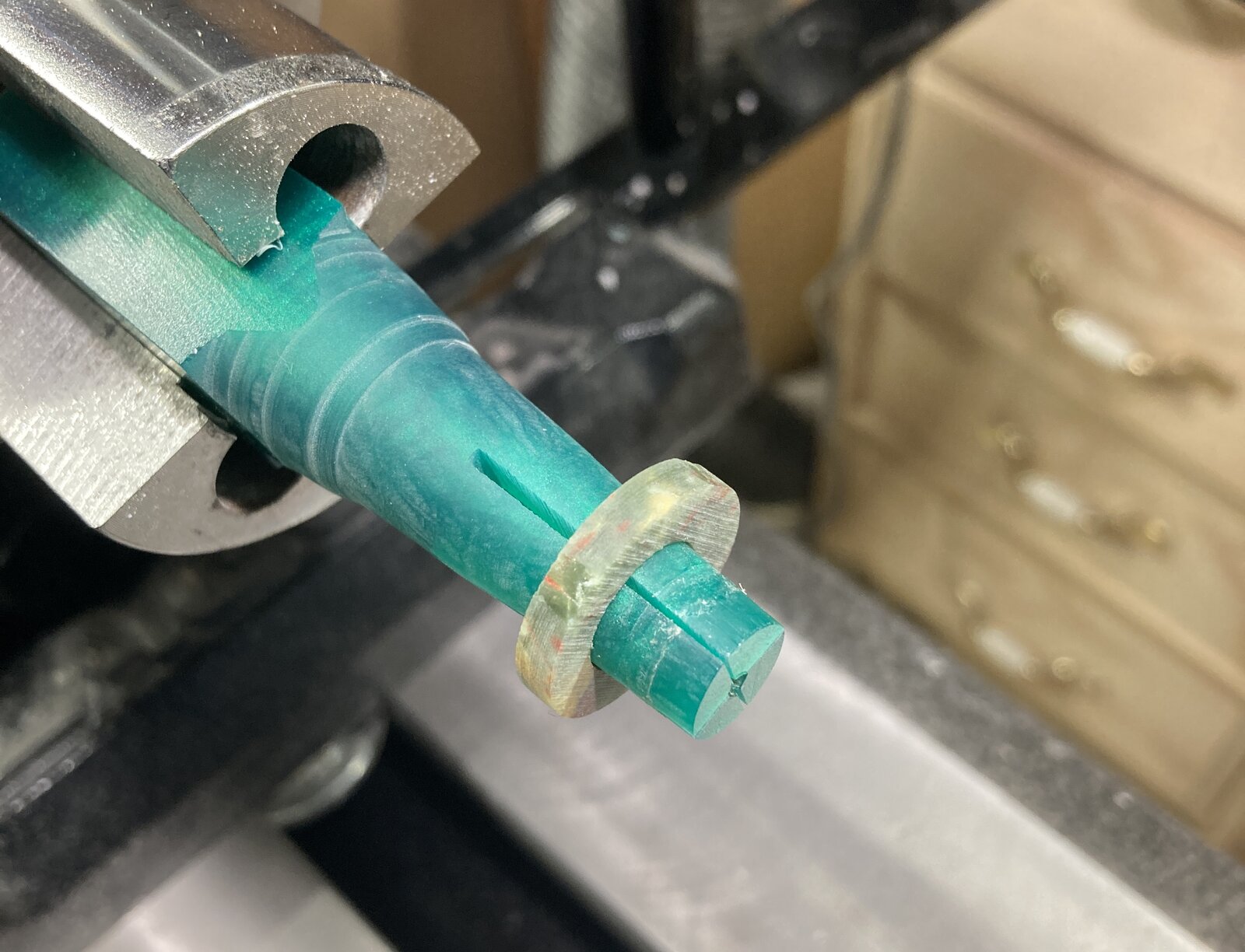 Then I had to figure out how to turn it. I started with a punch from my punch set as a mandrel, but I could not get a tight fit with the ring blank. I decided to turn my own mandrel out of a spare resin blank to the approximate diameter, with a taper so I can press it on.