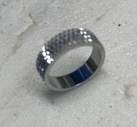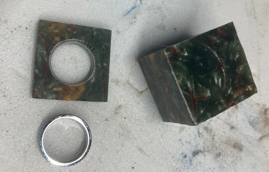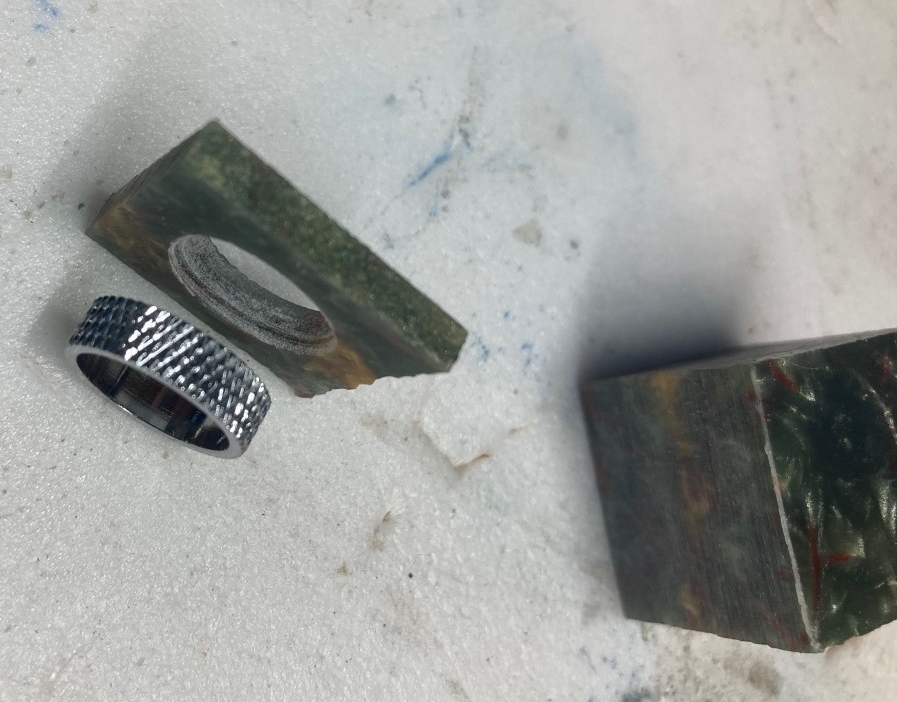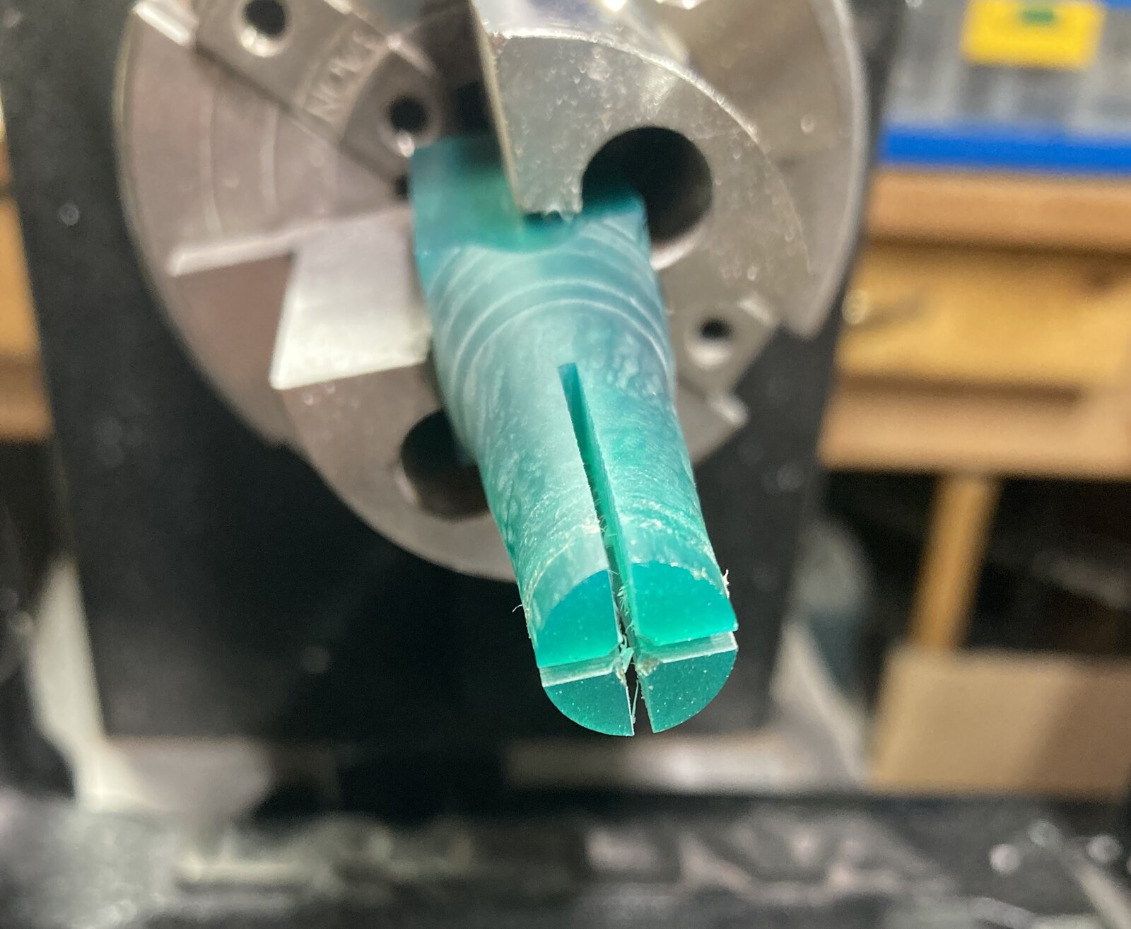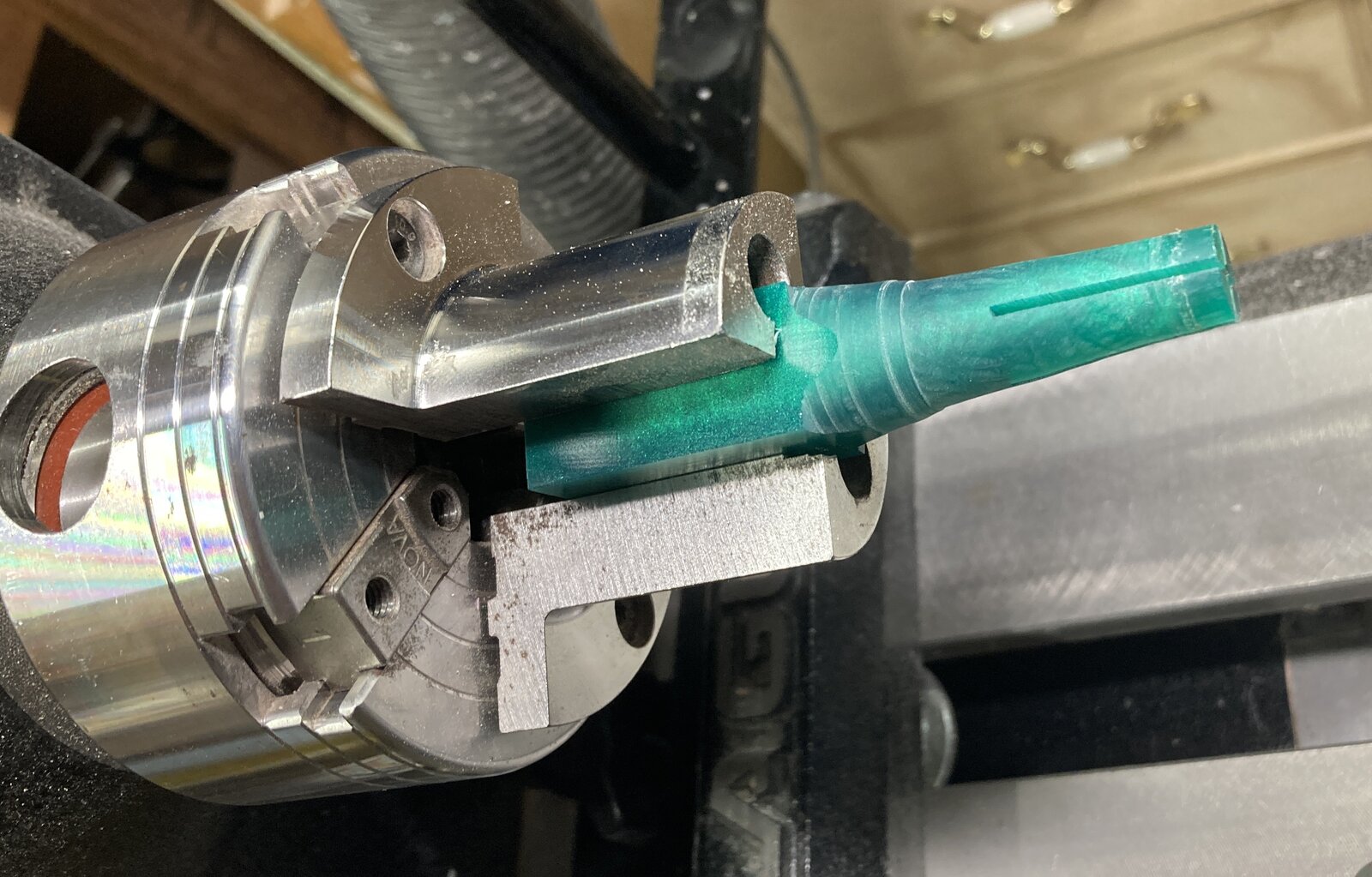 Then I had to figure out how to turn it. I started with a punch from my punch set as a mandrel, but I could not get a tight fit with the ring blank. I decided to turn my own mandrel out of a spare resin blank to the approximate diameter, with a taper so I can press it on.