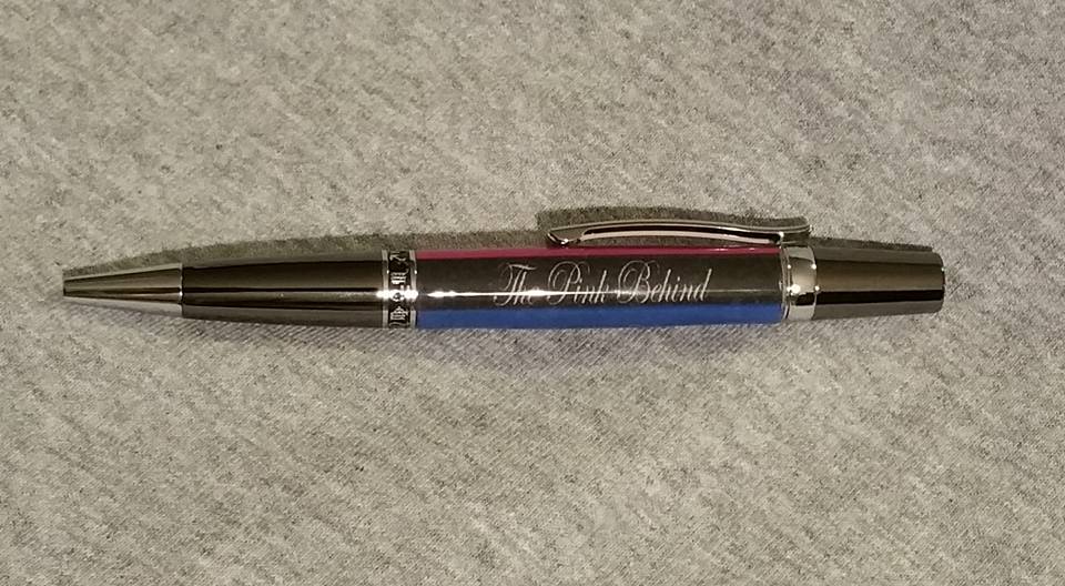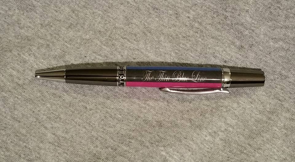 The pink/blue stripe pen shows two pics. It reads, 'The Pink Behind The Thin Blue Line'.