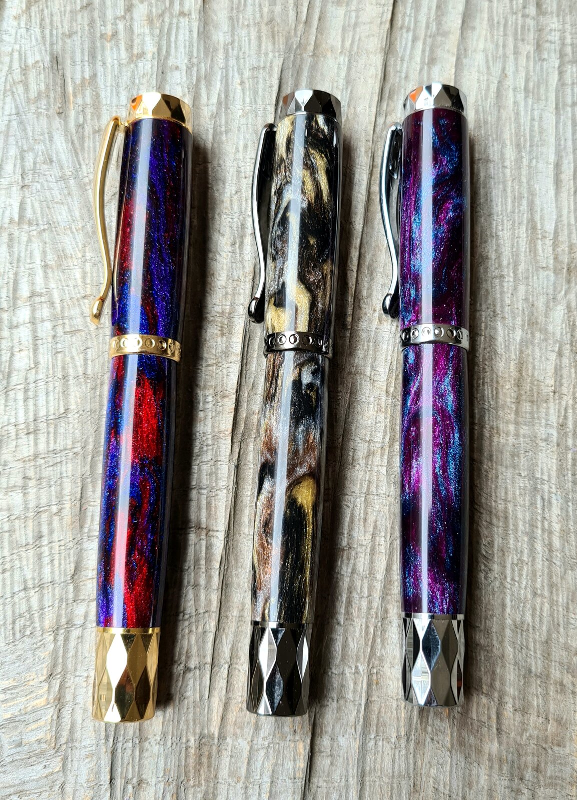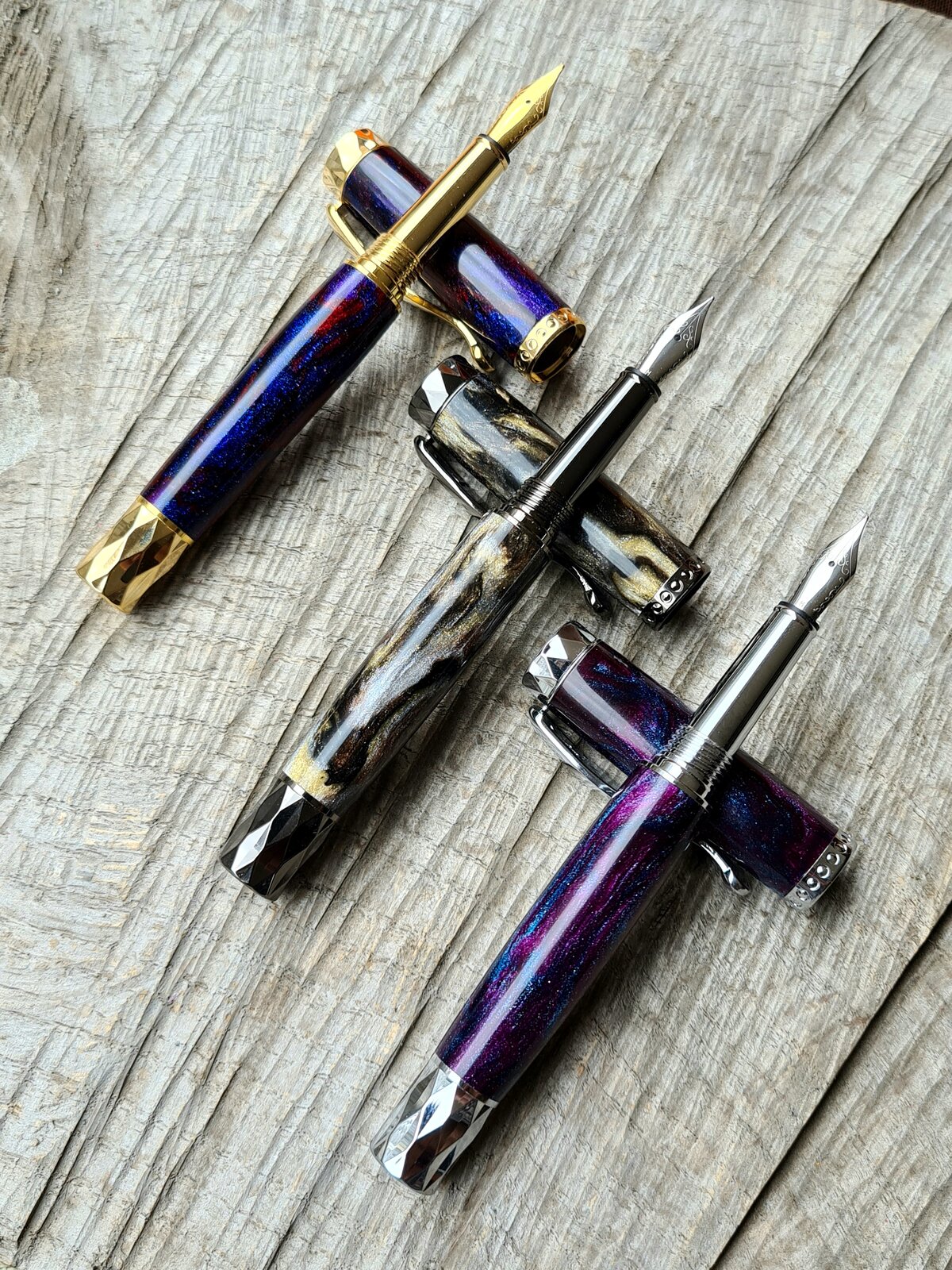 Paired these Berea Die cut Atrax kits with some of Tim from McKenzie penworks 's Diamondcast blanks. They are a dream to turn and come up fantastic. Purple one is orion, goldish one is metallurgy and blue red one is nebula. Thanks for looking