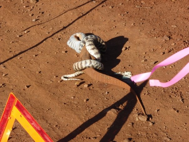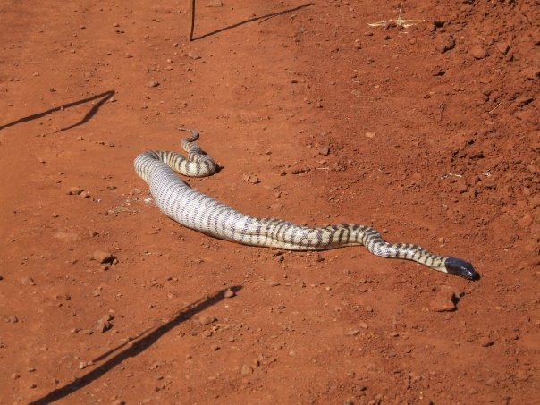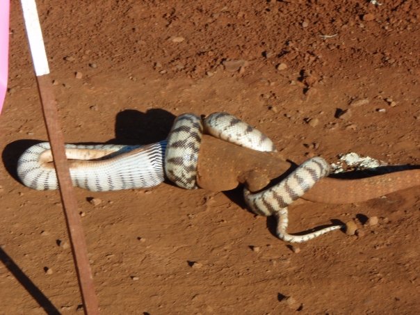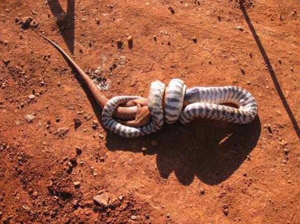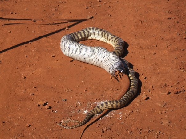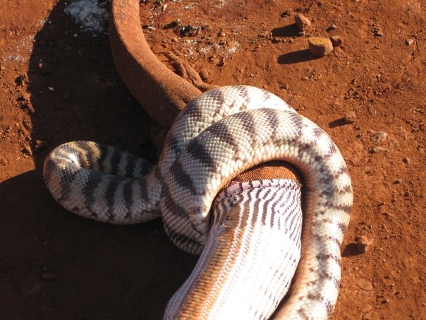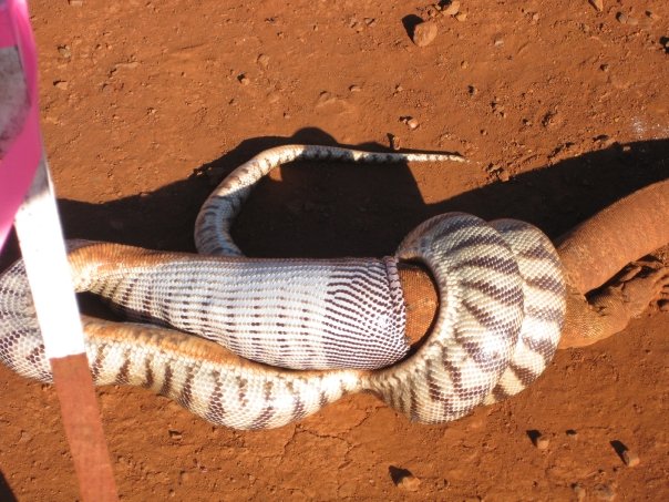 It took a total of 5 hours for the Desert King Snake to finish off the Goanna. (Sand Monitor).