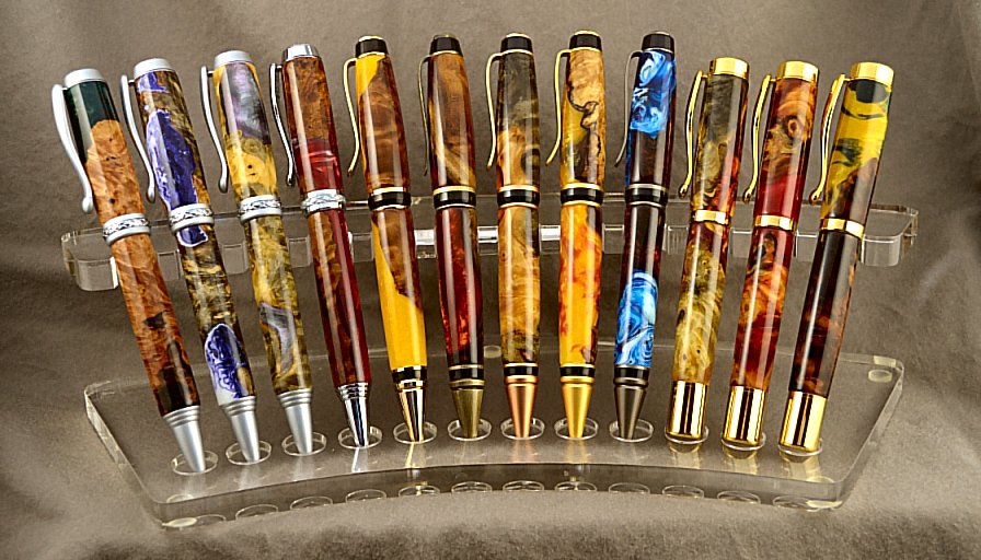 Set 2: Virages in Amboyna Burl, Amboyna Burl, and Maple Burl; Castellars in Amboyna Burl and Maple Burl; Jr. Georges in Amboyna Burl and Amboyna Burl; Atraxes in Buckeye Burl and Buckeye Burl; Slimline Pros in SpectraPly turning debris; Sierra Click in pinecone; and in the front an Ellipse in Narrah Burl