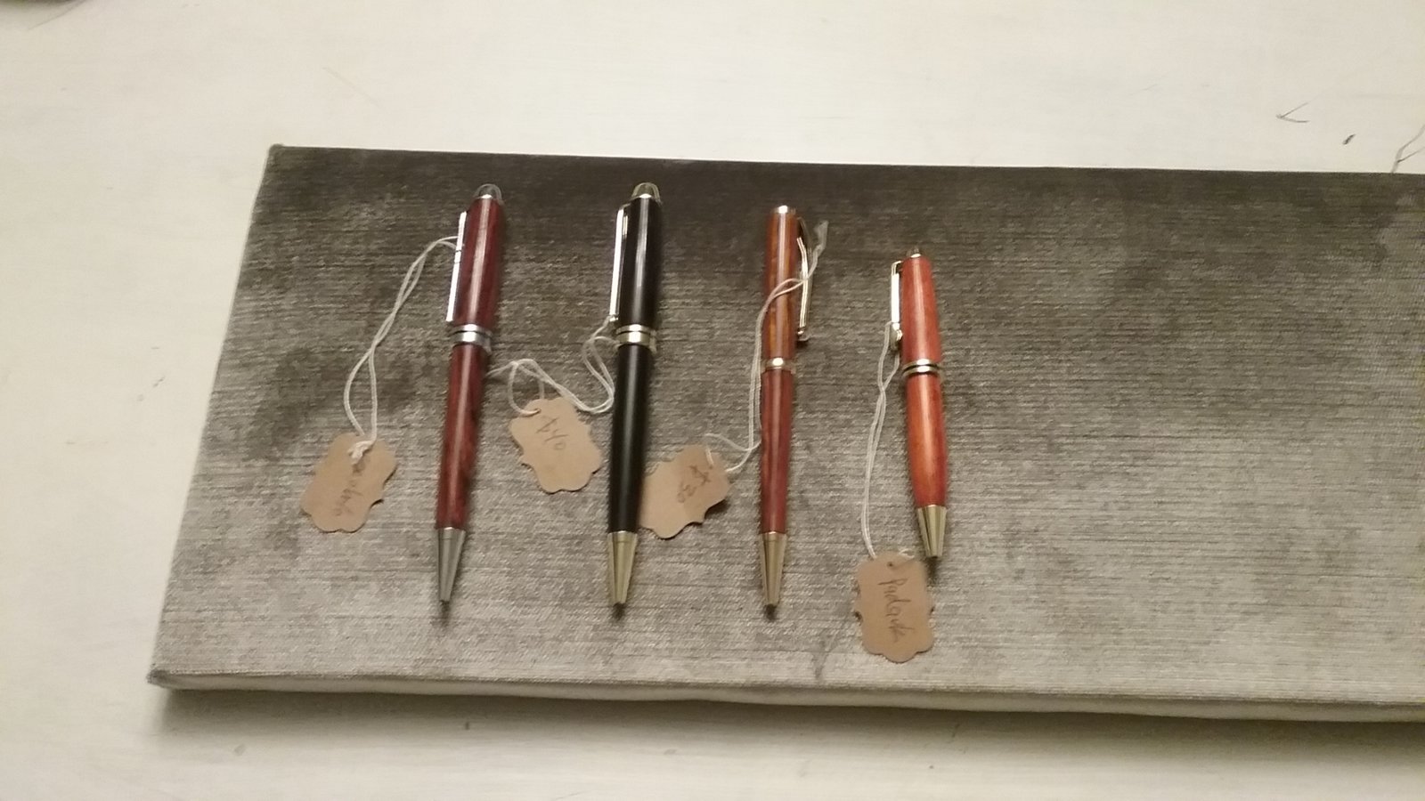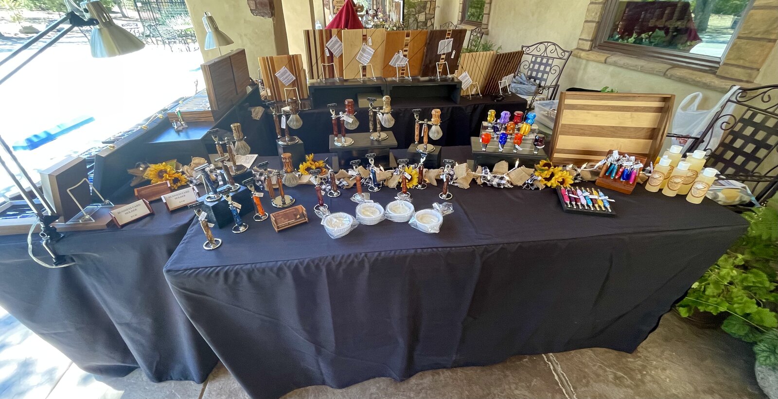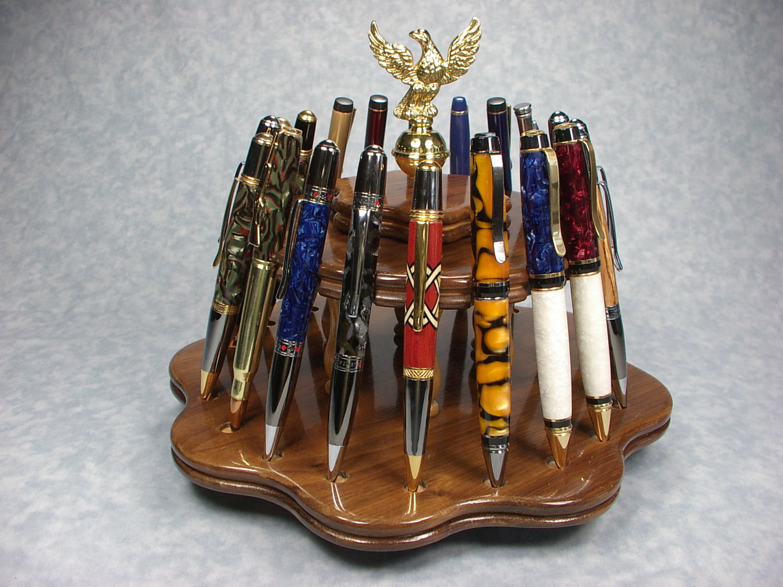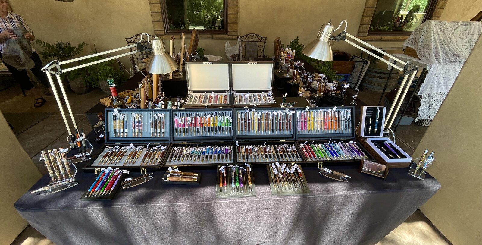 As far as props go I am limited in space when selling pens because I am a woodworker and scrollsawn items are my bread and butter. But As far as displaying pens I use various racks that I made. Shown some photos. I also use the tried and true single pen stands. I also sell high priced boxes and some lower end boxes and have those set up with pens inside to give suggestions. I also have about 3 or 4 small battery operated turntables set up with featured pens displayed on them. They draw attention. I then lay some lesser value pens up front for people to pick up and try out.