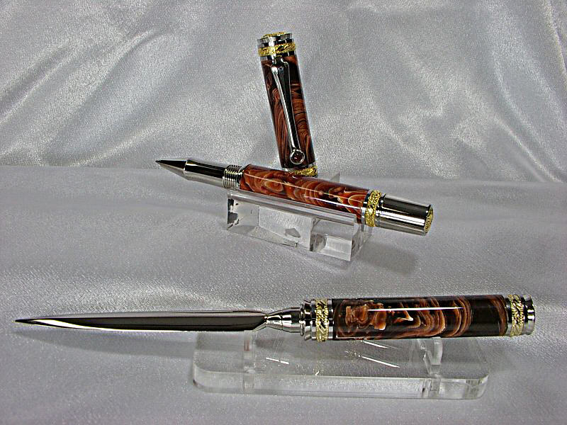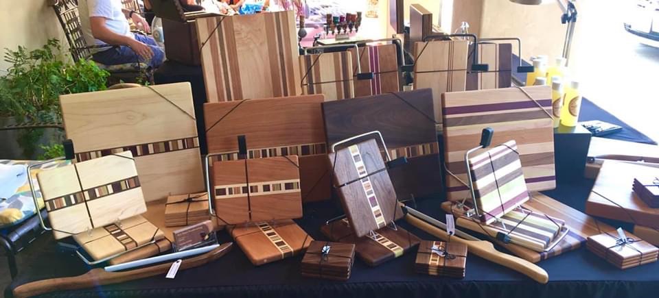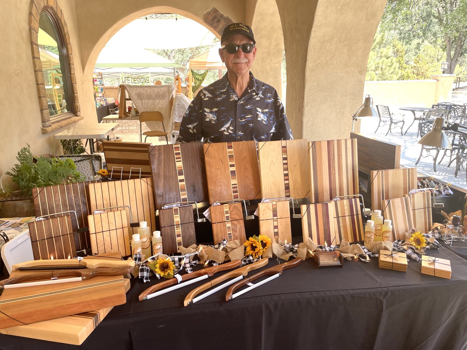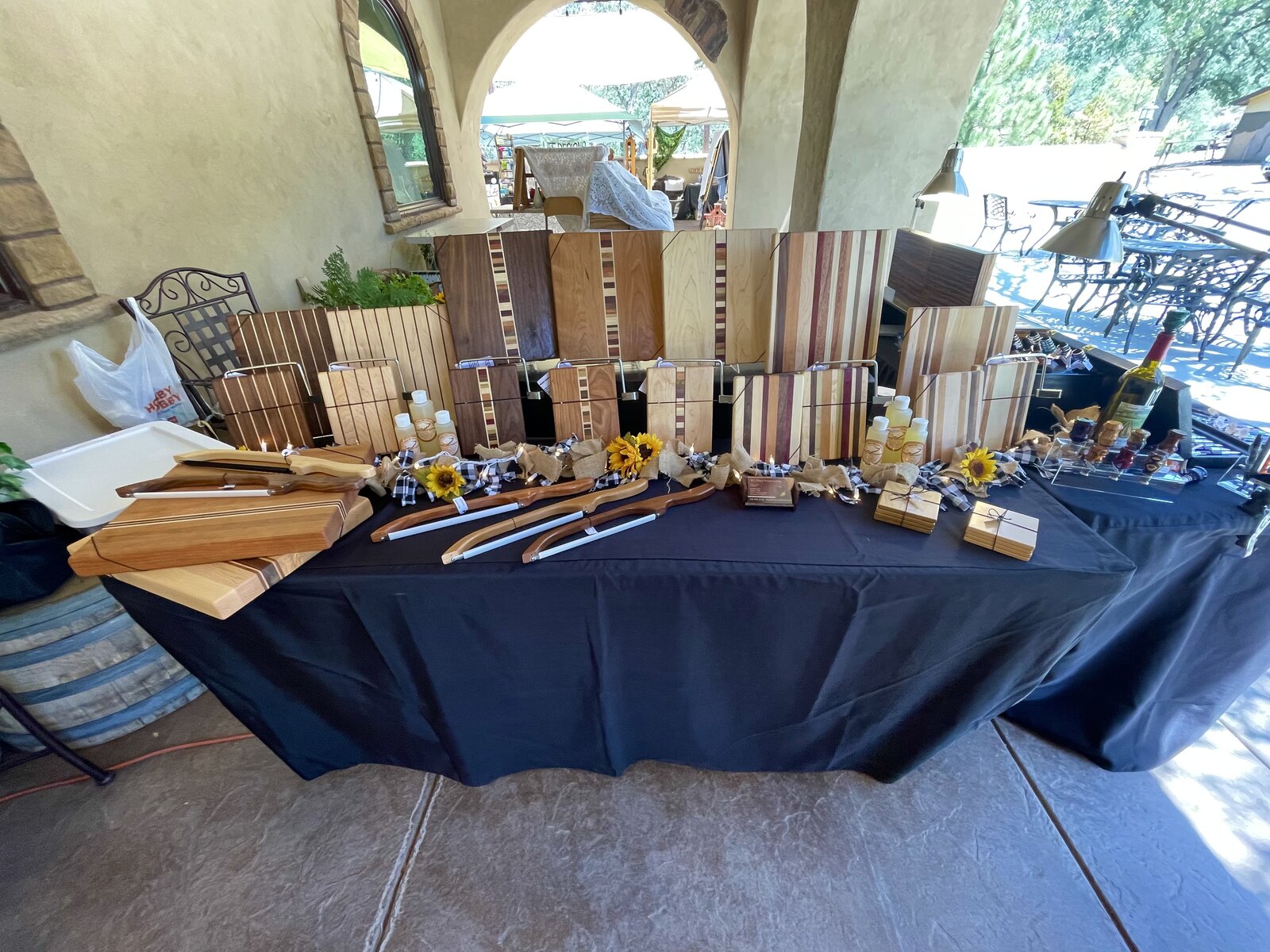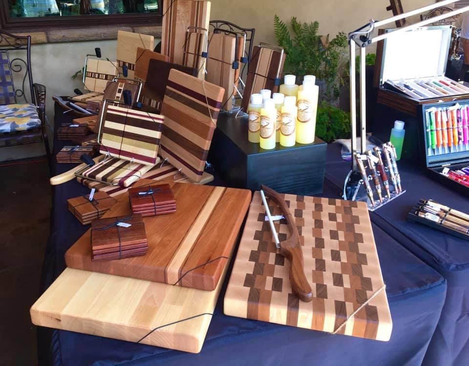 As far as props go I am limited in space when selling pens because I am a woodworker and scrollsawn items are my bread and butter. But As far as displaying pens I use various racks that I made. Shown some photos. I also use the tried and true single pen stands. I also sell high priced boxes and some lower end boxes and have those set up with pens inside to give suggestions. I also have about 3 or 4 small battery operated turntables set up with featured pens displayed on them. They draw attention. I then lay some lesser value pens up front for people to pick up and try out.