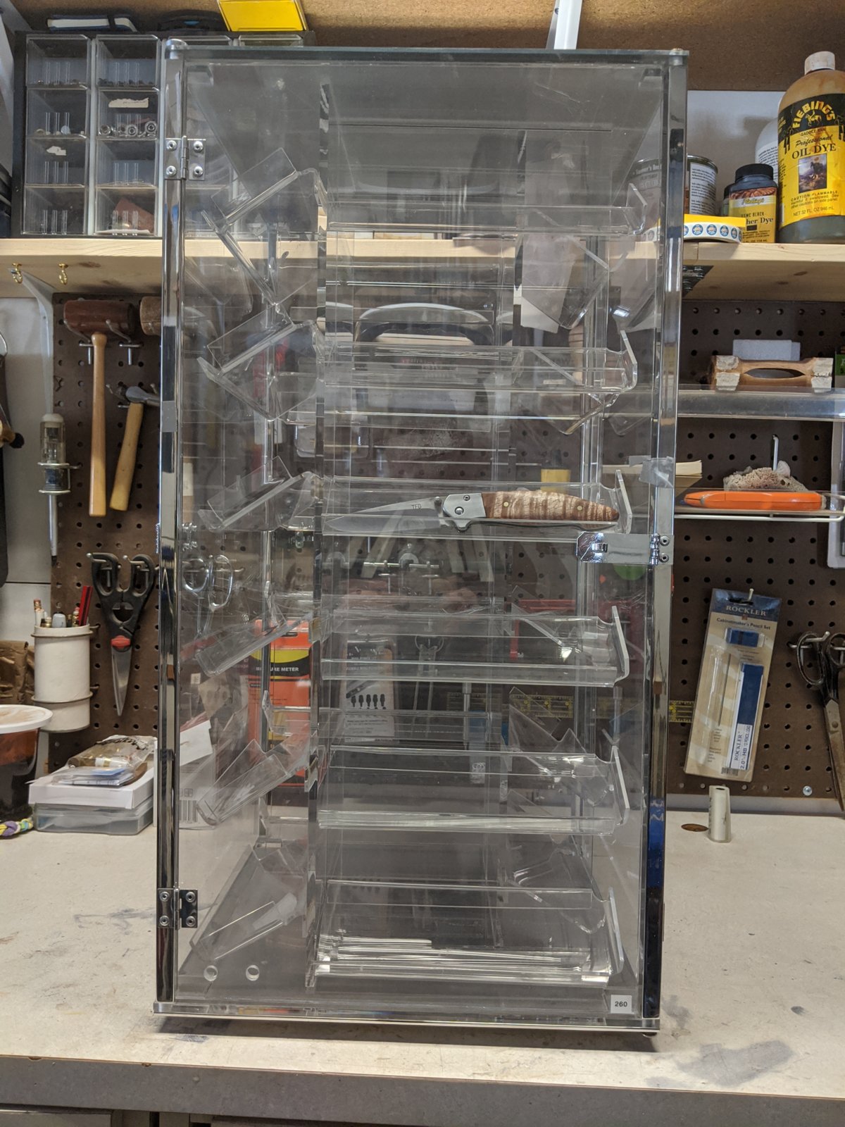 Our local Macy's shut down and they were selling everything...Cheap. I got two of these stands, one for $60.00 and the other for $56.25. They're probably $200-300 cases. Each case will hold 48 pens or 24 knives. They lock and I will use them as displays at each end of my table with the other type of fixtures shown above in the table middle. Check your local stores that are going out of business, you might find something like these. I do like the ideas shown above, I know I can use these ideas.