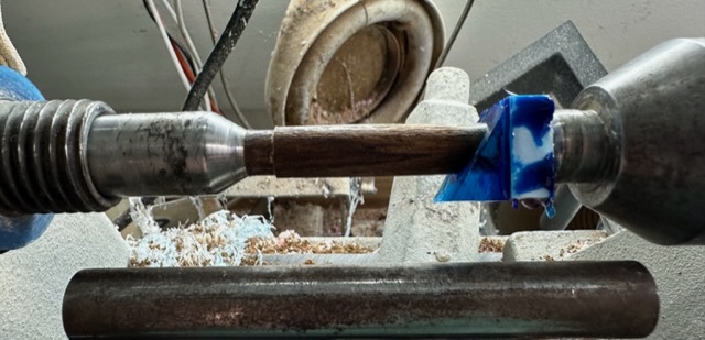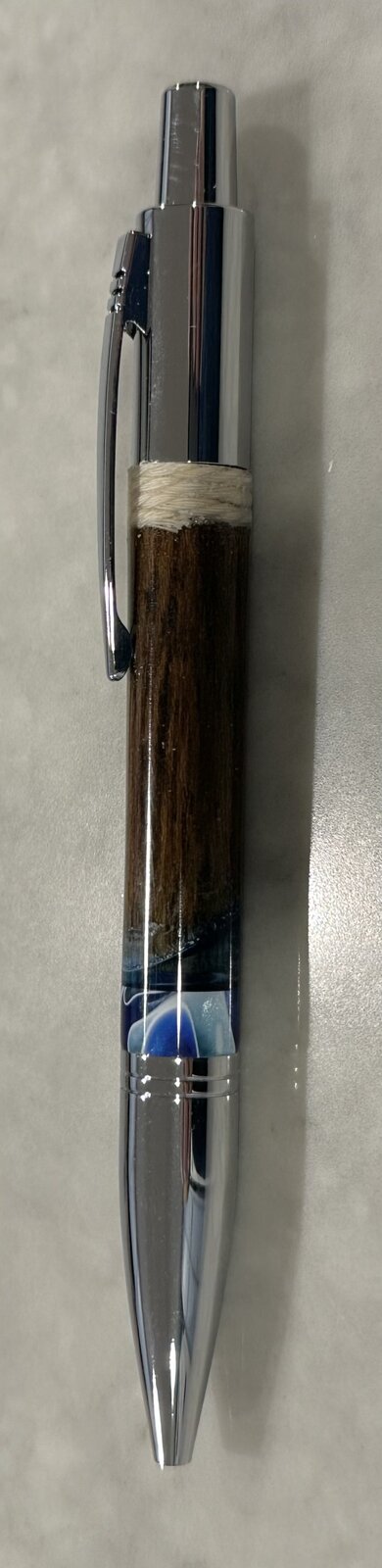 it started with some teak for the piling itself. The kit is a Vesper from Exotics. It has more meat on the tube than some other styles. I over turned the teak so that my piling could be seen through the transparent blue of the wave. Once turned and squared, I added the acrylic.