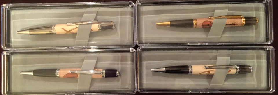 A group of us in the Nashville area has been getting together monthly to turn and have fun. In October, Ken (Kallenshaan Woods), being the great guy he is, wanted to help us get the group going so he sent some inlay kits for us to put together and turn. As a gift, I decided I would never sell these, but one day put them to use for a great cause. So I polished them and sent them to be auctioned off tomorrow evening. The two Christian Fish is from Constant and the Violin and Football is from Ken.