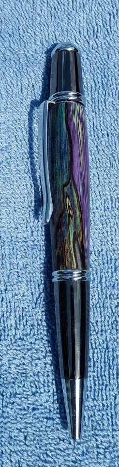Just a quick cell phone photo of a pen with a blank I made. It's Spalted Tulip Poplar stabilized and double-dyed green & purple.