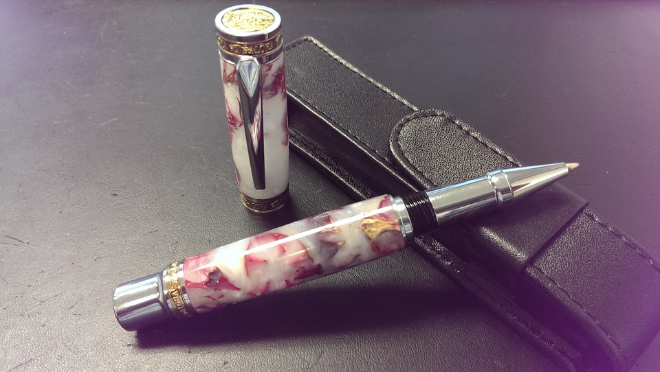 The other issue is that the blank, from Ed, is an artisan made pearl white with Hibiscus flower petals, and I was warned that the blank could have some voids and bubbles that would need to be filled, which is what I experienced. My problem is that once it was turned down, I filled the voids in with CA, hit it with accelerator, then sanded them back down to level only to find that they were voids again. I ended up doing this over and over until I finally gave up and polished and assembled the pen. I wont' be able to sell it and luckily my wife loves it and will keep it for herself, but I am a bit concerned about my technique. Was my mistake in not letting the CA set up long enough and could the thickness of the material in the body cause the differences in appearance?