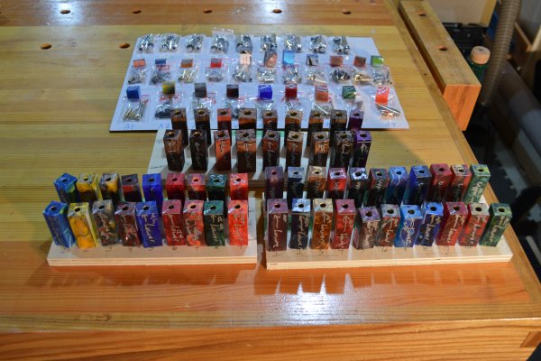 2.) Make a carrier, which can be as simple as a board with some finish nails pounded in. Get in the habit of standing the barrels on the carrier between steps. It also helps for keeping barrel orientations for two piece pens. Sort of like this: