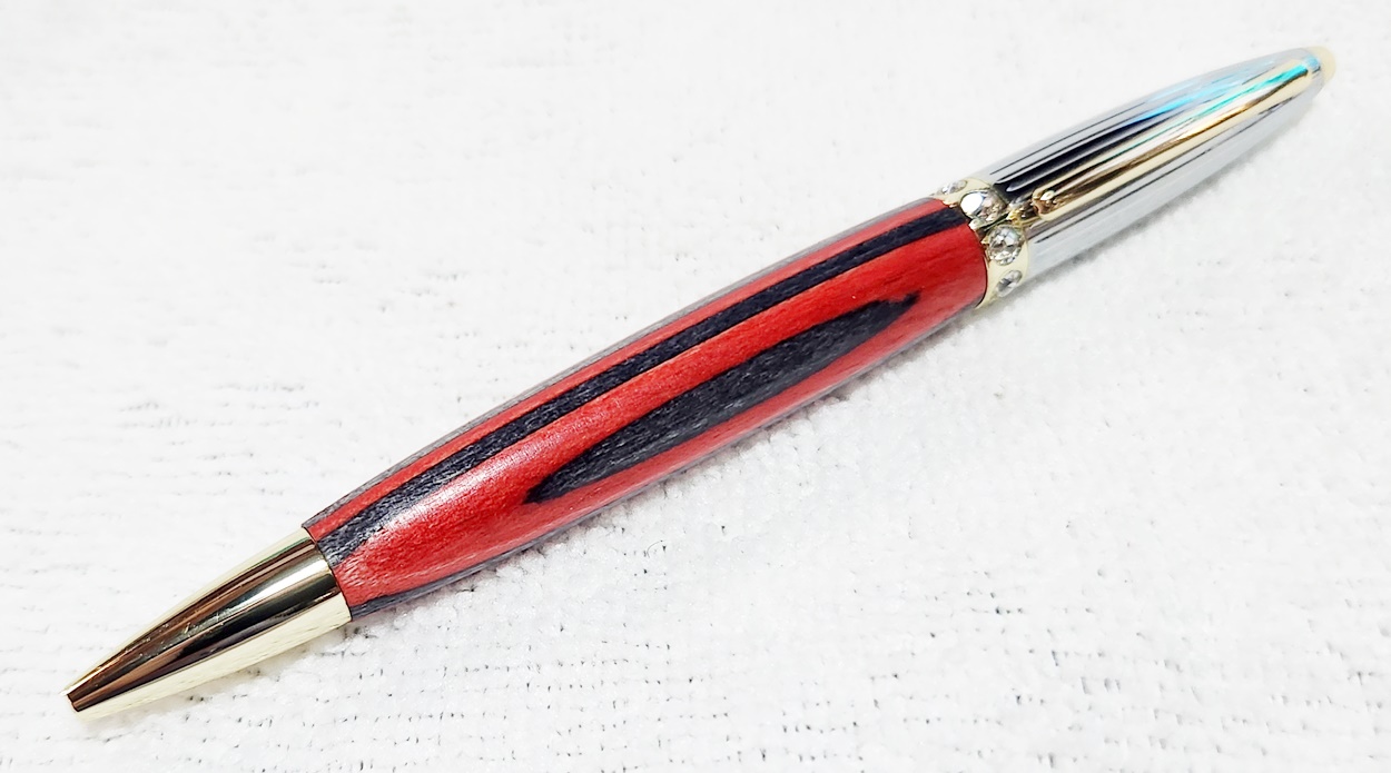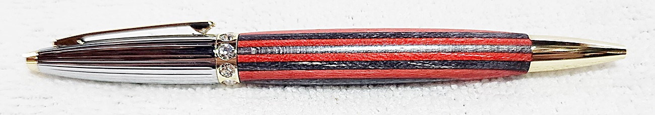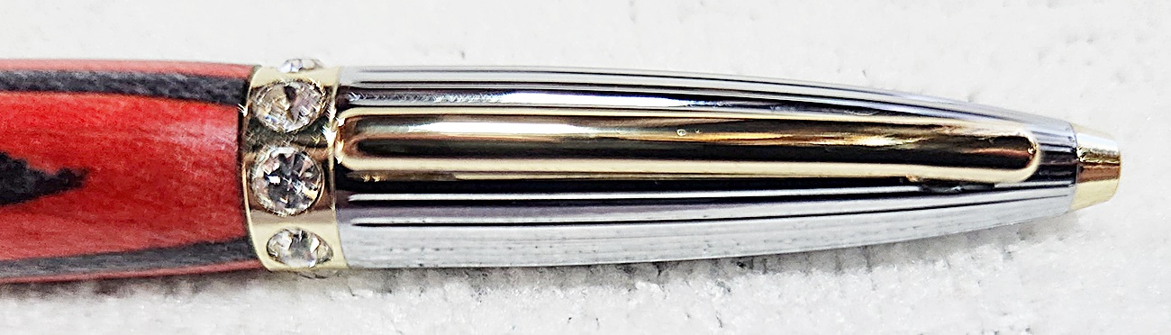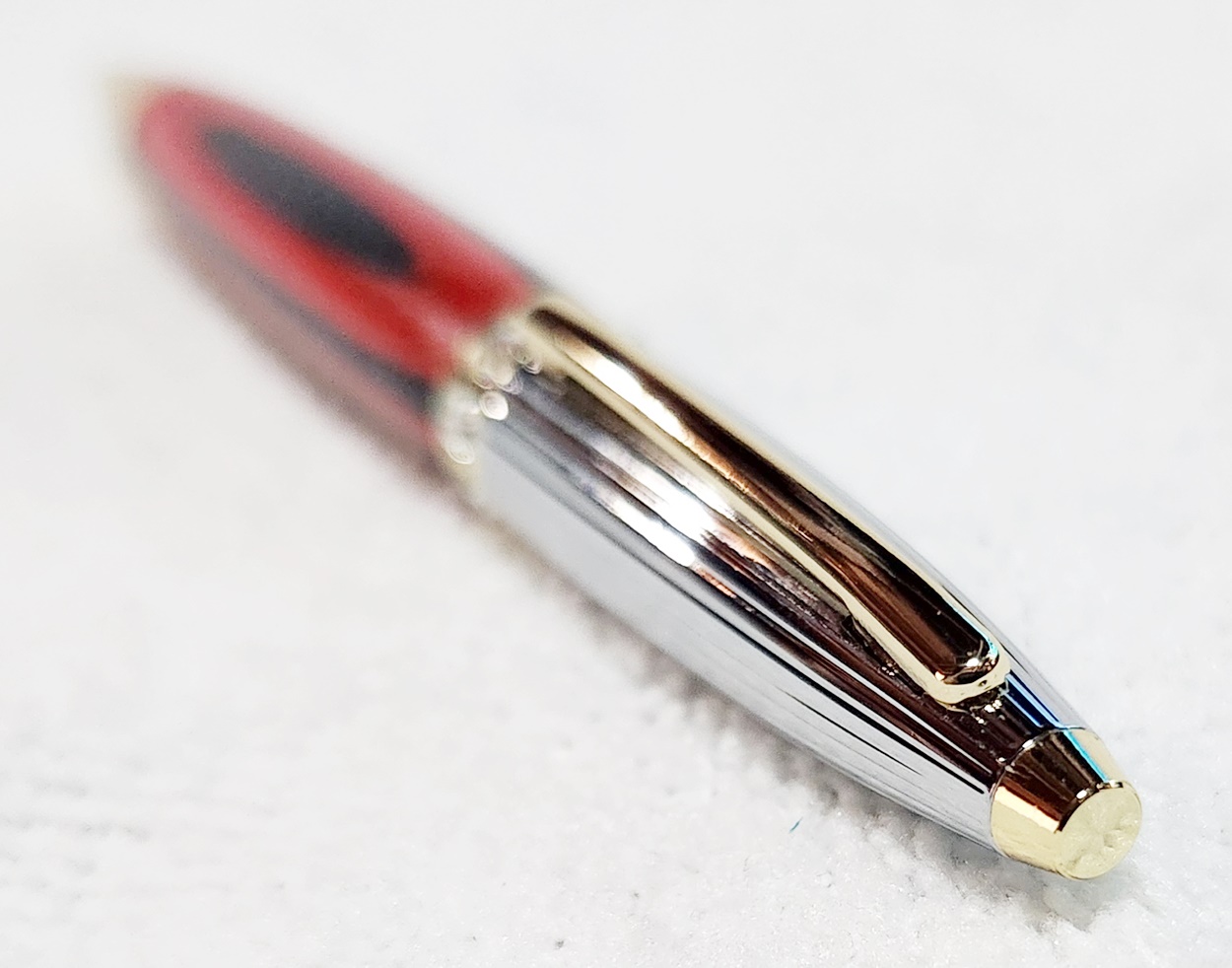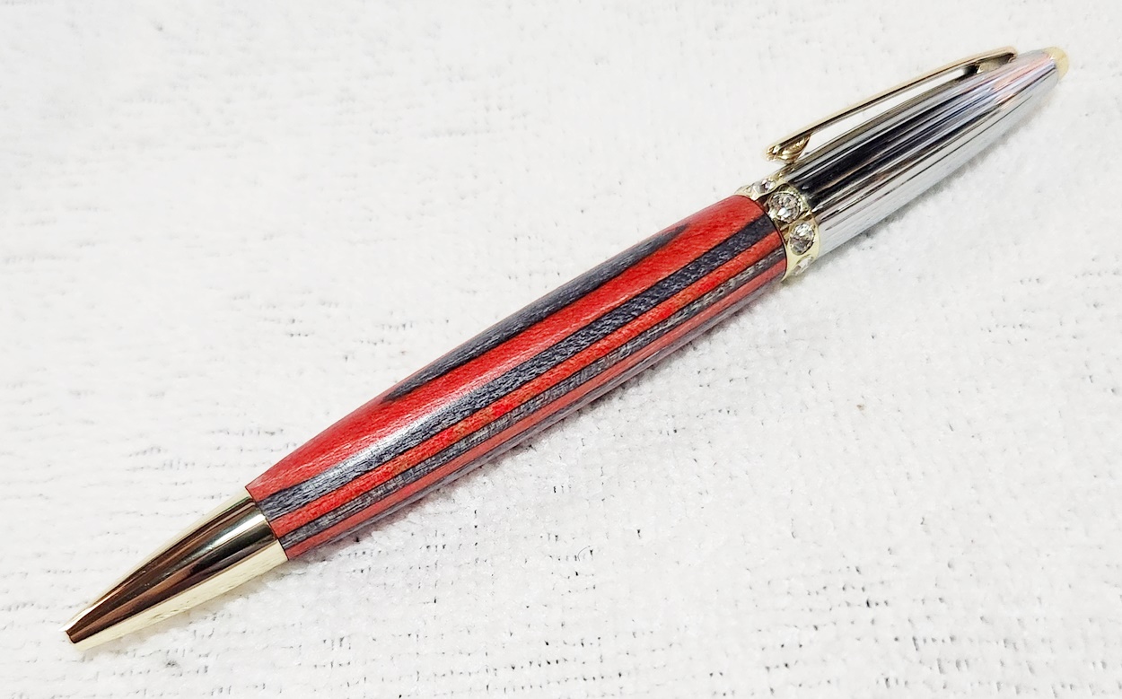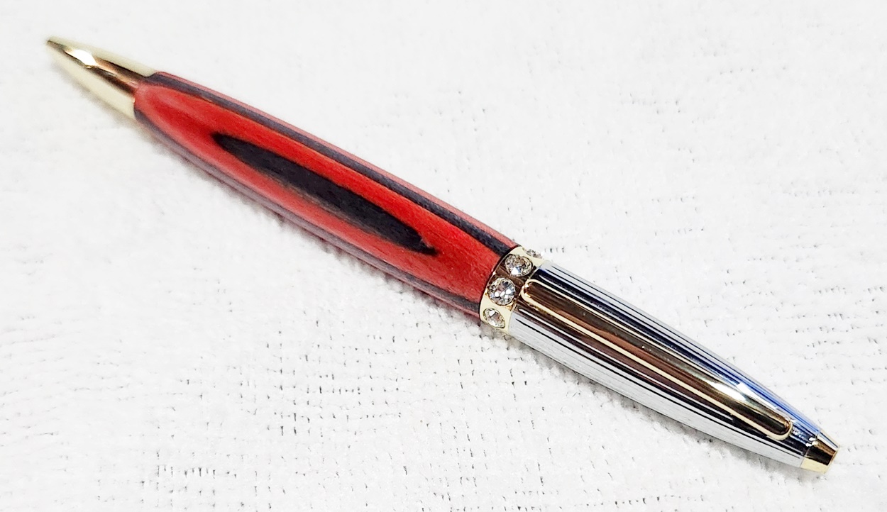 This is a PSI Duchess twist pen in chrome and gold. The body is a SpectraPly called Applejack, from Woodcraft. The finish is Pens Plus.