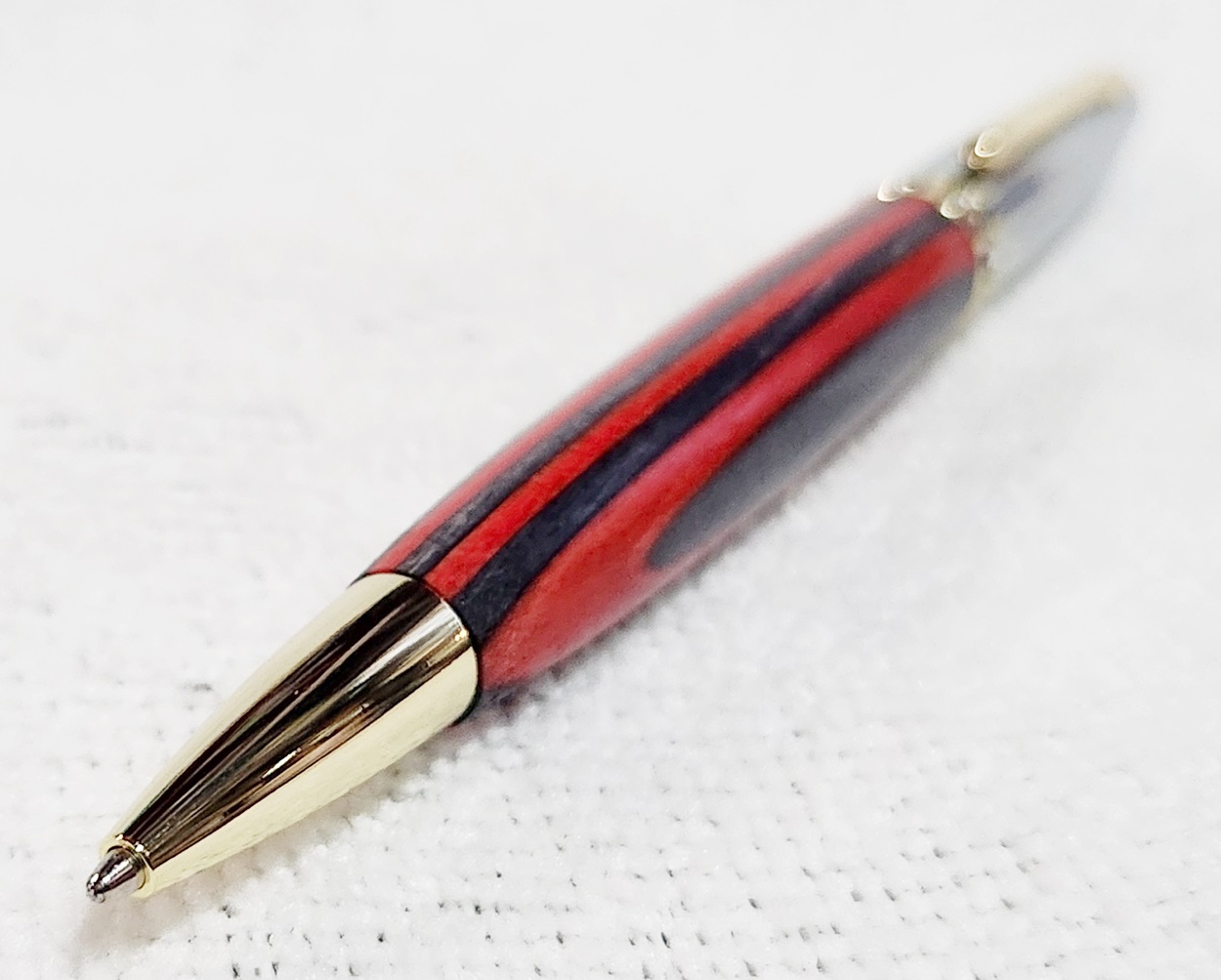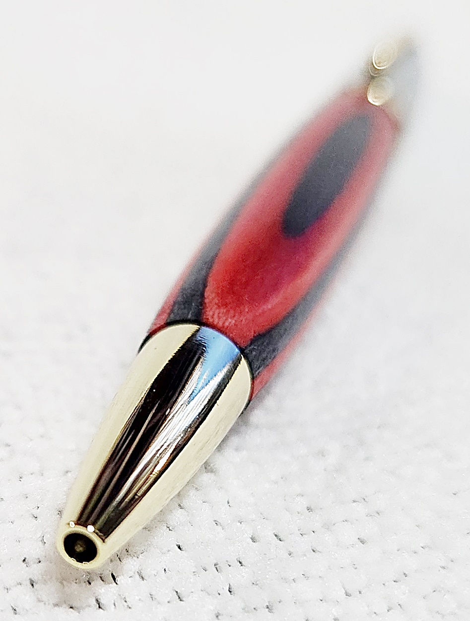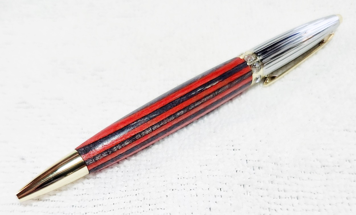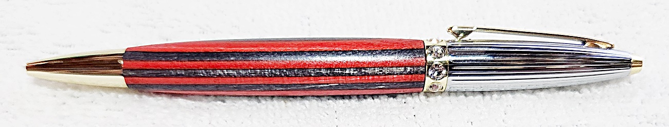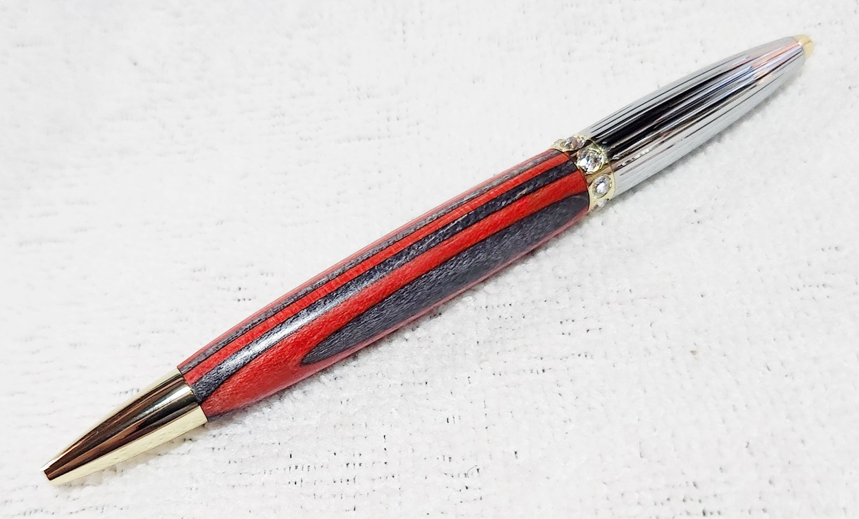 This is a PSI Duchess twist pen in chrome and gold. The body is a SpectraPly called Applejack, from Woodcraft. The finish is Pens Plus.
