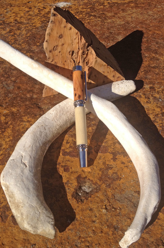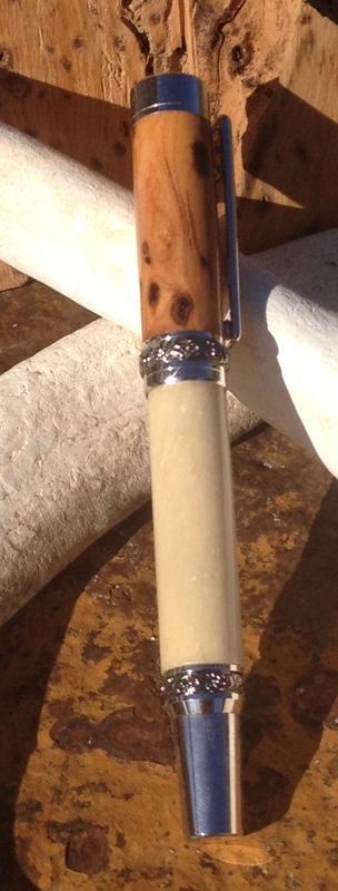 I haven't made a pen for a while so made this for a friend from his hidden special stash. The bottom is made from a very old Dugong rib bone he got many years ago from a deserted beach. The cap is from some Birds-eye Sandalwood, again he scored many years ago. Both are endangered here in Aus these days so extremely rare to get my hands on some. Kit is a Black Titanium Roman Harvest, finish CA.