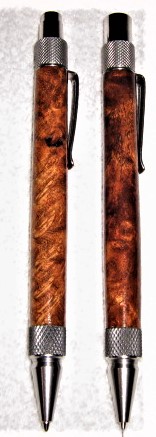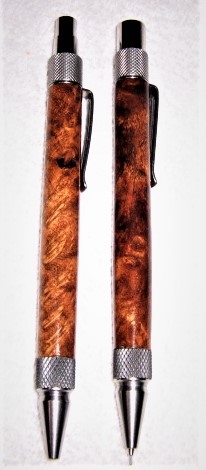 Dura click pen & pencil set, Mesquite burl and with modified nib couplers, made out of stainless steel knurled, the mesquite burls centers are 3.25" long
