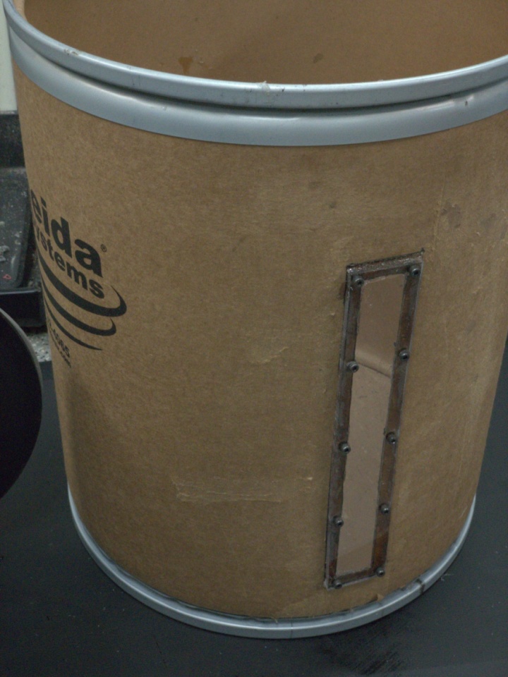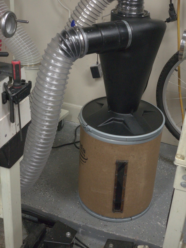 I purchased an Oneida Super Dust Deputy with a dust bin.The Dust Deputy sits on the dust bin made out of fiberboard with a thin sticky foam gasket. It's a fifteen gallon bin and was worried about being unable to see the level of wood debris, shavings, debris or dust and that it would get sucked into the JET. The sensor that Oneida sells is expensive. Someone on another site (Sawmill Creek) gave me an idea of a window for the dust bin. I got some Lexan, 8600 Sealant and some socket head screws and put the window in.