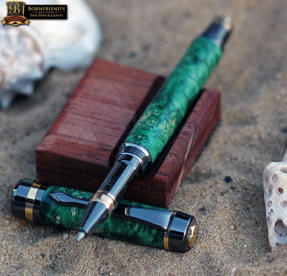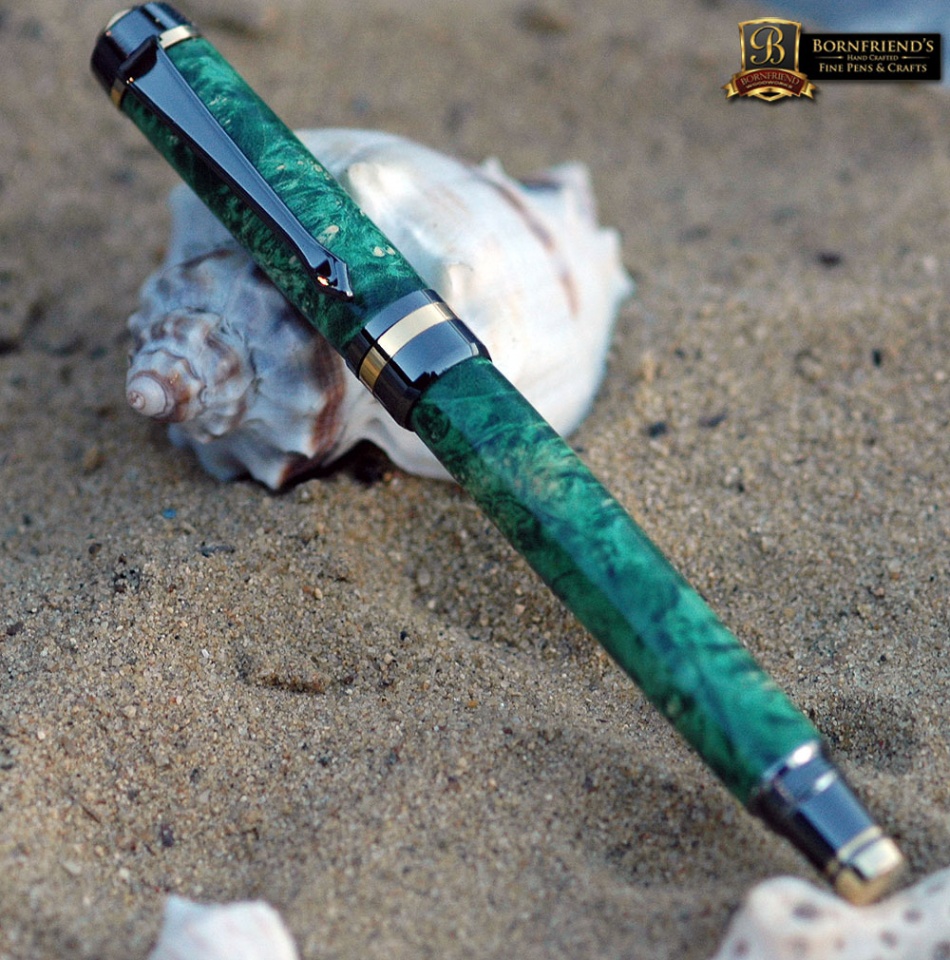 Beautiful Pen, Rick. Glorious Green Dyed Box Elder Blank. Excellent choice of hardware. Great Fit and Finish. Congratulations. Brian.