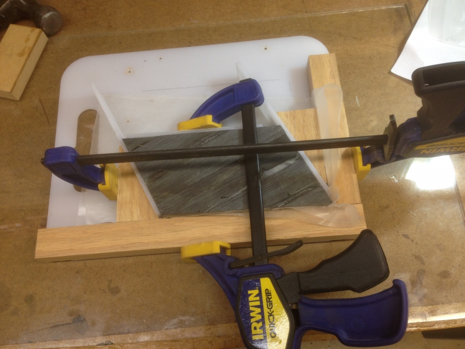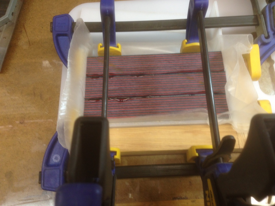 I then glued up the Dymondwood slab and clamped it to the jig as shown in the third photo.