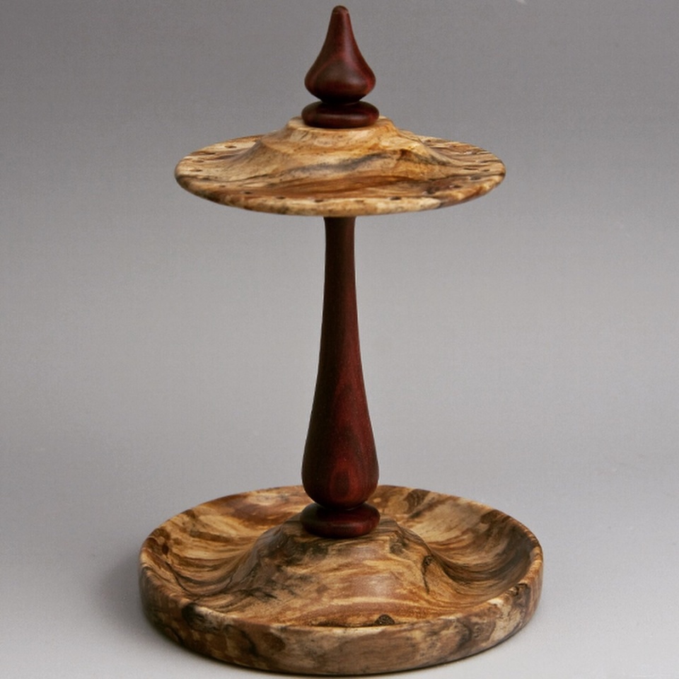 The colours of the spalted crabapple in this earring stand are amazing. I've got to get some more of this stabilized. Have to dig out the snow to get to the shed though. The Chakte Kok adds just that extra touch.
