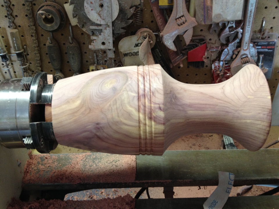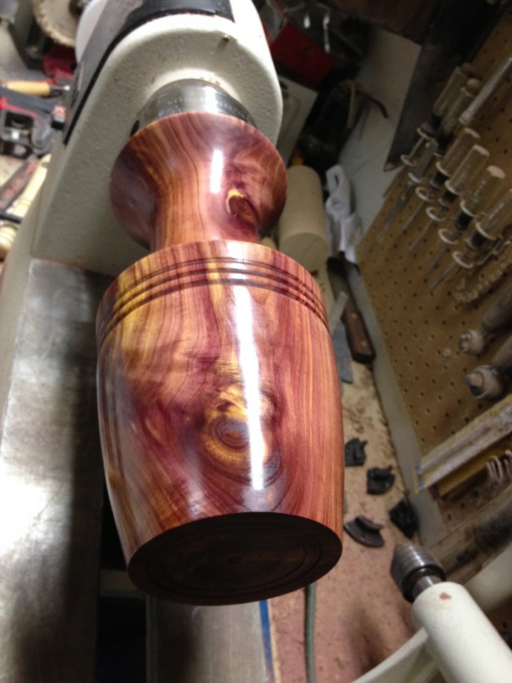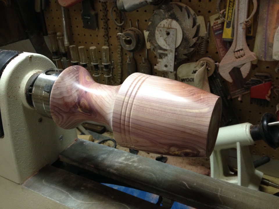 Overall, I like the shape and design but, personally, I feel that the neck might have been a tad too tall for the width. But only by maybe an inch. I like the beading you put on the body and the transition between the neck and body is well defined. I get the feeling that the transition was a bit sharper before sanding. Was it? ERC can be such a pain to sand and keep sharp details. I also like how the shape of the bottom was done; nice, crisp edge.