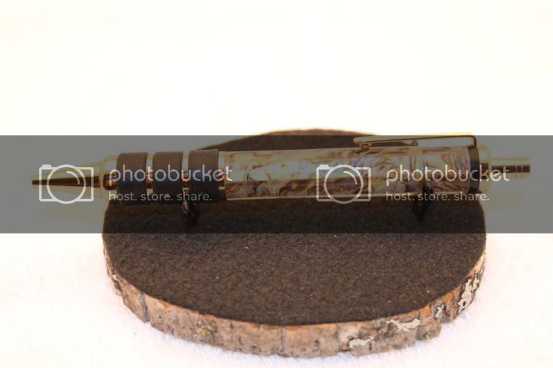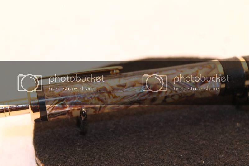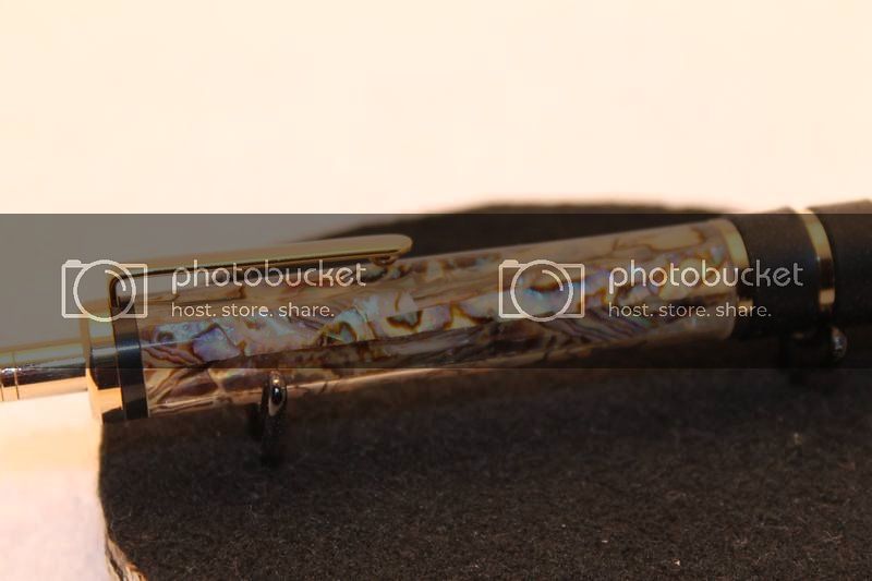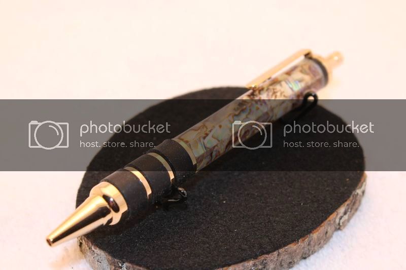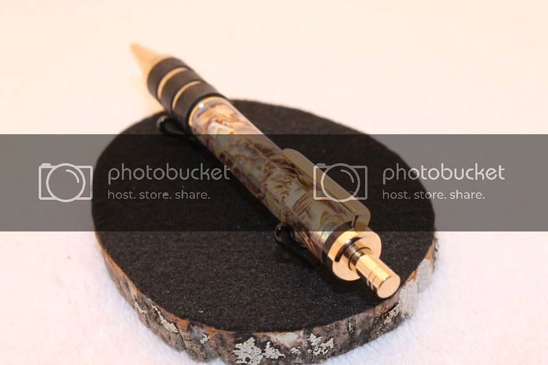 I saw the beautiful abalone blanks at classicnib and exoticblanks and I wanted to try it myself. I bought a sheet of abalone veneer on ebay and with an xacto knife cut it into strips and used cast'n'craft from michaels. I'm really pleased that I managed to not blow it up on the lathe! At the time of making this one, I was on a real kick with the Guardian Jr. pens from PSI. The Gold just really fit.