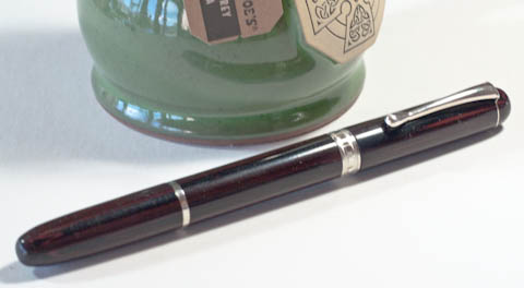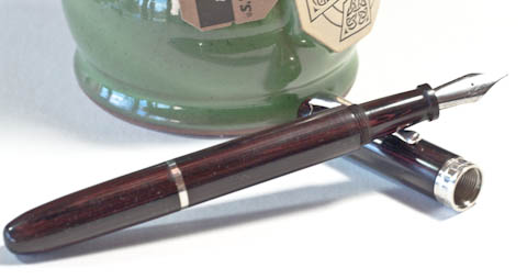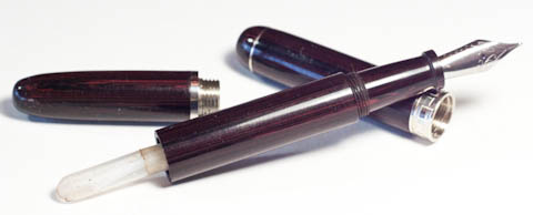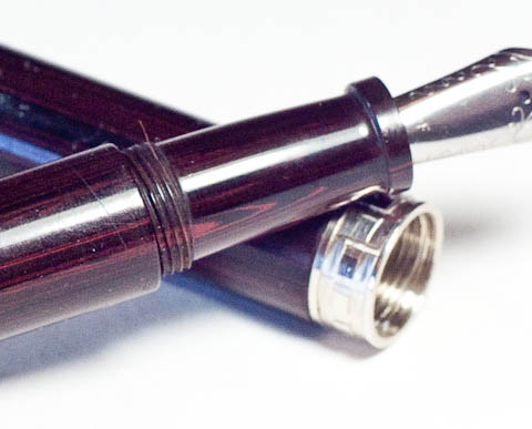 It didn't photograph well, but this is a nicely grained piece of black and red German ebonite. It's trimmed in nickel silver with a center band engraved in a Greek "key" design.
